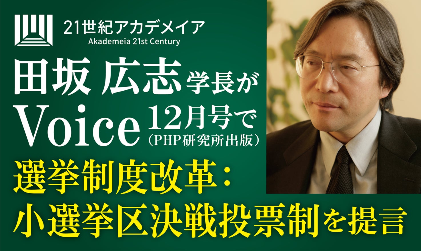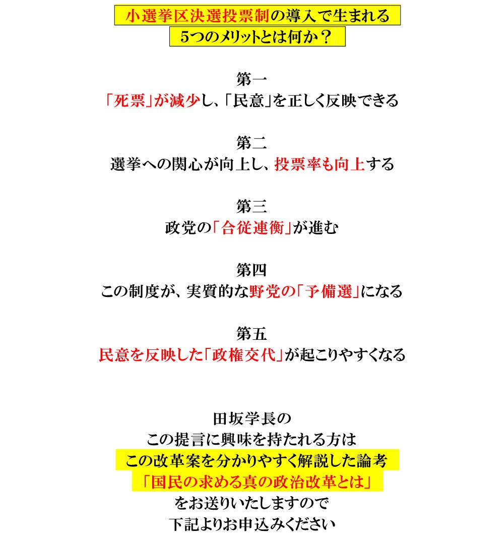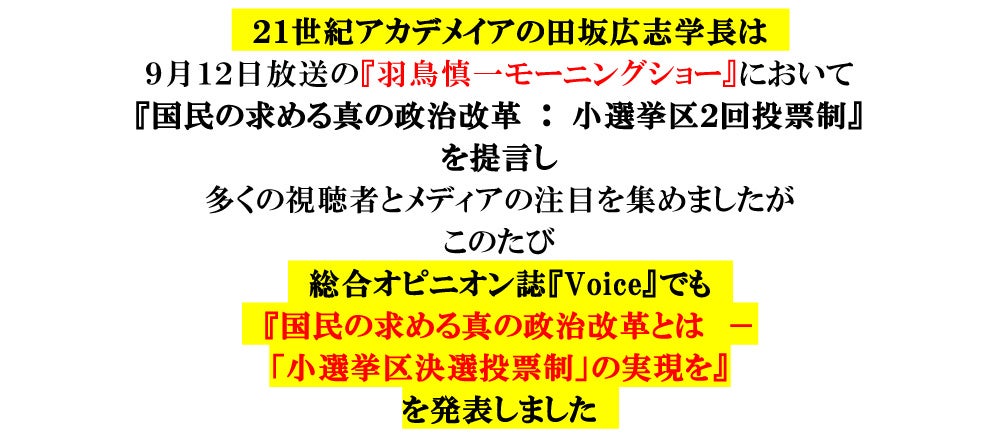 田坂広志学長が、今回の総選挙の結果を踏まえ、我が国の抜本的な政治改革を実現する「小選挙区決選投票制」を提言。11月6日発売の月刊誌『Voice』に具体的提言が掲載されますので、解説論考を配布します