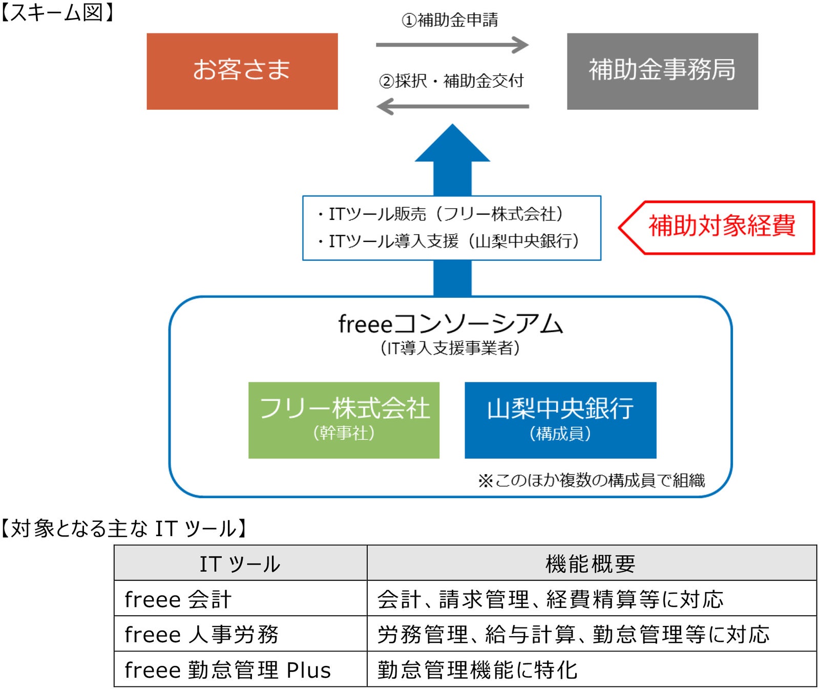 当行は、IT導入支援事業者である「freeeコンソーシアム」(幹事社:フリー株式会社)に構成員として参画いたしました。これにより、同社製のITツールの利用料、および当行が実施するIT導入支援のコンサルティング費用につきまして、審査を経て補助金(通常枠1/2、インボイス枠3/4 等)が交付されます。