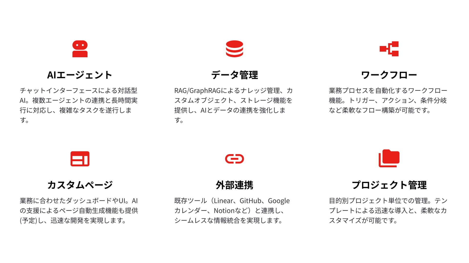 AIエージェントを核とした新しいエンタープライズAIプラットフォームです。プロジェクト単位でデータとワークフロー、エージェントを統合管理し、AIが持つ潜在能力を最大限に引き出します。