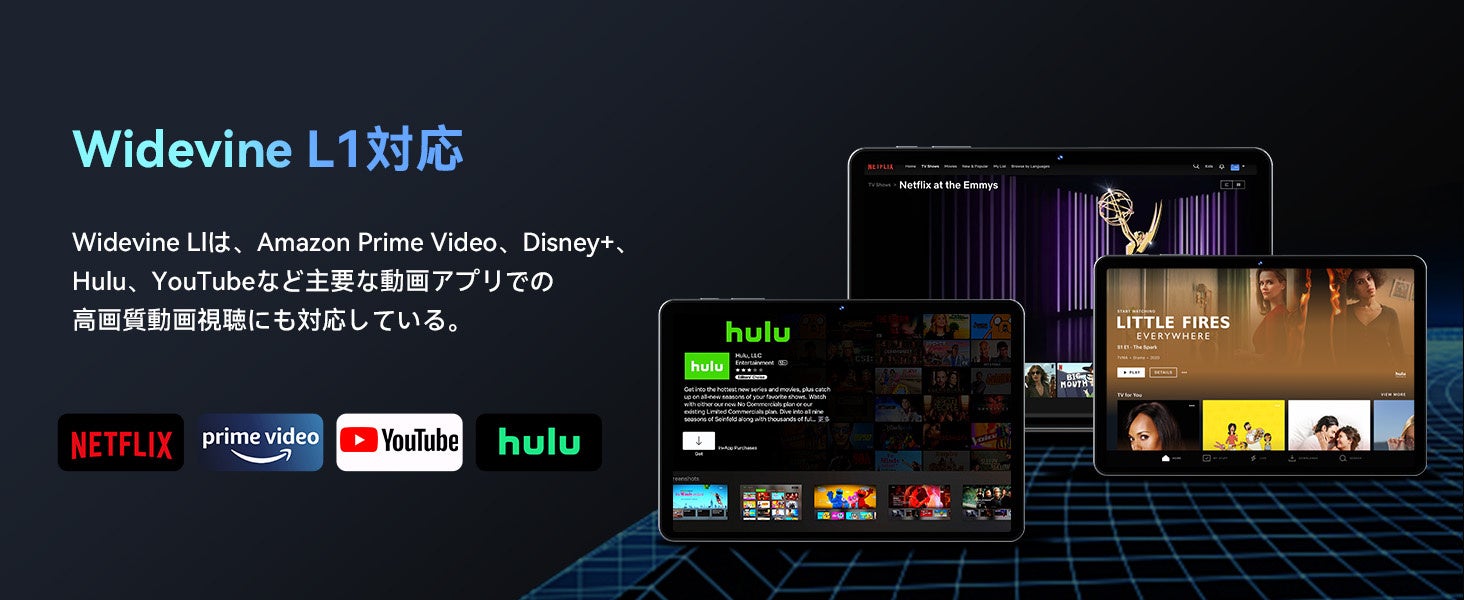 鮮やかな10インチHD IPSディスプレイ&Android15 OSを搭載。高性能チップ「UNISOC T615」(A523比約2倍高速)により、重いマルチタスクやゲームもサクサク快適。さらに、Widevine L1対応で、Netflix、Prime Videoなどの動画を1080P HD高画質で再生可能です。