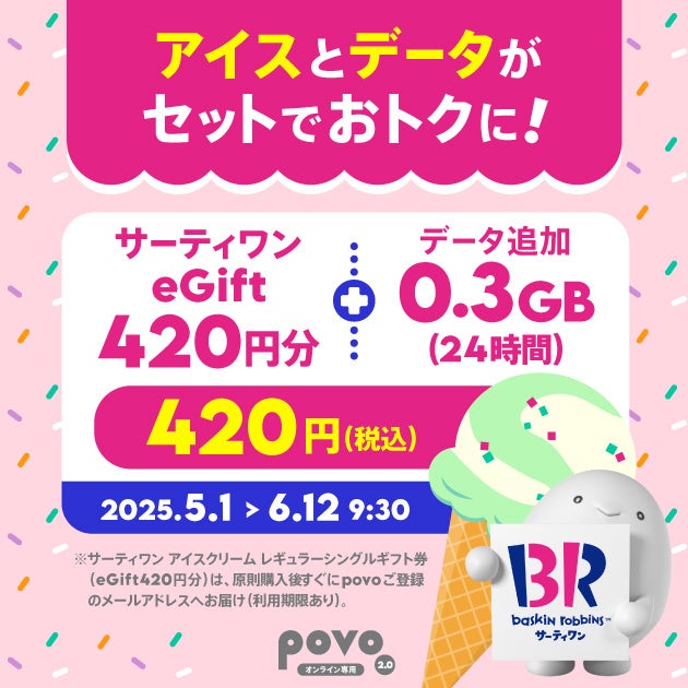 サーティワン アイスクリームの「サーティワン eGift420円分(レギュラーシングルギフト券)」とpovo2.0の「0.3GB(24時間)」がセットになったトッピングを提供します。データが少し足りない時に便利な0.3GBが実質無料でご利用いただけます。データのちょい足しとあわせて、アイスを楽しみたいお客さまにおすすめです。