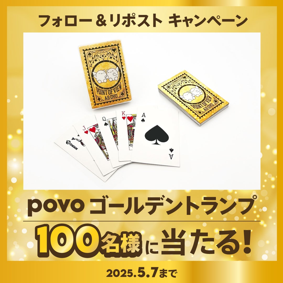5月1日にpovoの公式Xで実施するフォロー&リポストキャンペーンで、抽選で100名にpovoオリジナルのゴールデントランプをプレゼントします。金色のトランプでおうち時間を楽しみませんか。