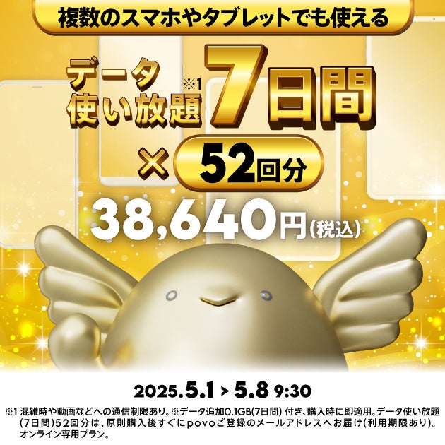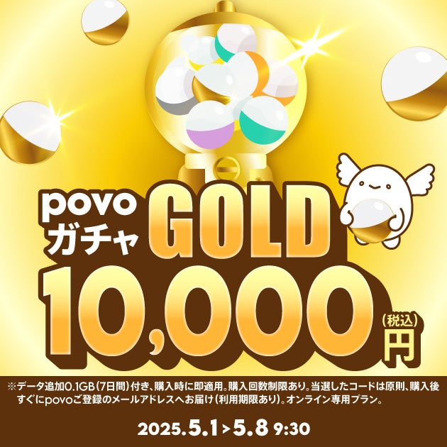 povo、ゴールデンウィークキャンペーン第2弾で最大52週間分の使い放題があたる「povoガチャ ゴールド」などを提供