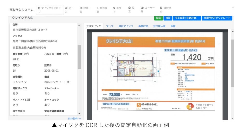 査定自動化システムはプロパティエージェント株式会社が開発したサービスです。各仲介会社から送られてくる紙帳票のマイソクをOCR※2にて、駅、エリア、築年数、賃料等の情報を読取り、これらの情報をもとに自動的に収支計算を行うシステムになります。従来1枚ずつすべての項目を手作業でシステムに入力していた作業が、月200時間以上削減することに成功していました。
