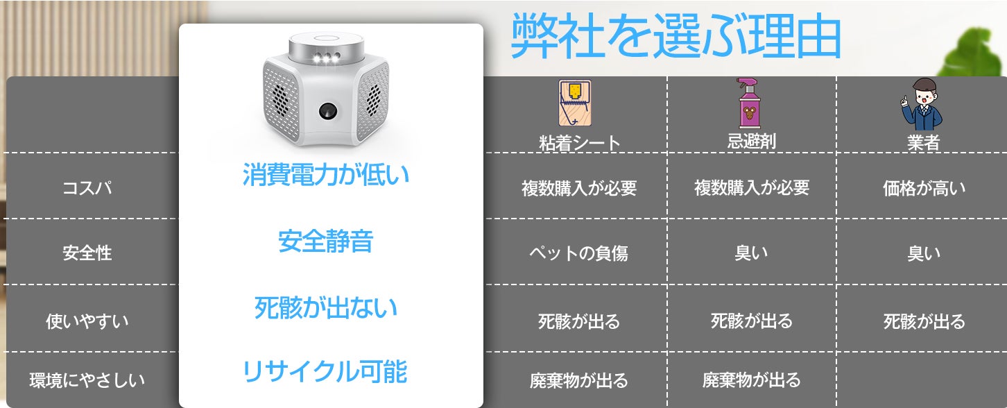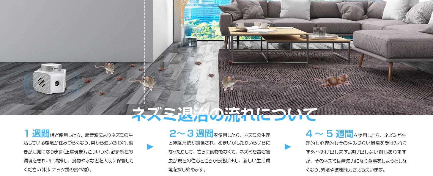 物理的な超音波技術を用いた本製品は、無害で安全。化学物質を一切使用せず、妊婦や赤ちゃんがいる家庭にも配慮した設計です。消費電力も少なく、24時間連続使用でも電気代は数円程度と経済的。害虫が超音波に反応する様子は個体によって異なりますが、徐々に動きが鈍くなり、最終的には害虫が自ら姿を消します。