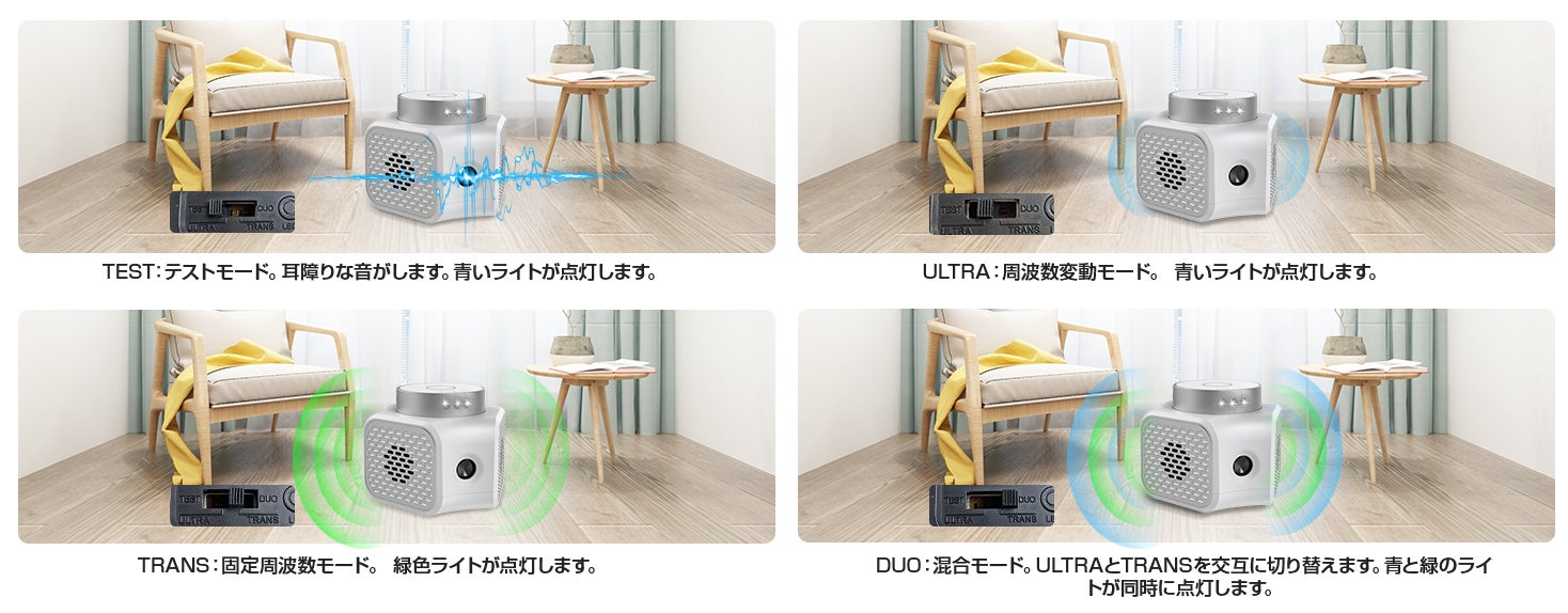 家に人がいるときには静音モード「ULTRA」を、いないときには強力モード「DUO」や「TRANS」を選べます。さらに、テストモードで簡単に動作確認が可能。ネズミやゴキブリだけでなく、蚊やアリ、ハエ、ダニなど多様な害虫にも対応します。製品には日本語取扱説明書が付属しており、購入後も安心してご利用いただけます。