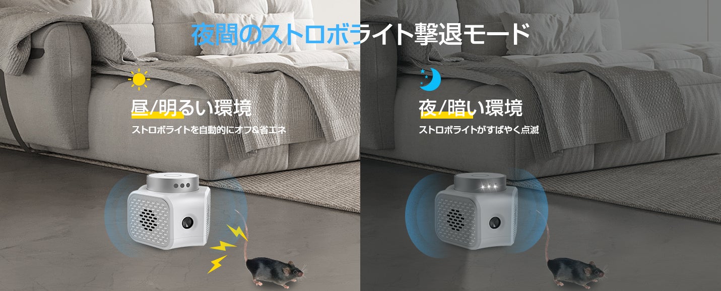 Aeemrn駆除器は、特に夜間の駆除効果を高めるため、ストロボライトを搭載。これにより、害虫が「適応性」を持つ可能性を抑え、より効果的に撃退します。また、9つのLEDライトと3つのスピーカーによる強力な組み合わせで、従来の製品よりも広範囲に効果を発揮し、対応する害虫の種類も増加しました。最大約350平方メートル(230畳)をカバーし、様々な場所で使用できます。