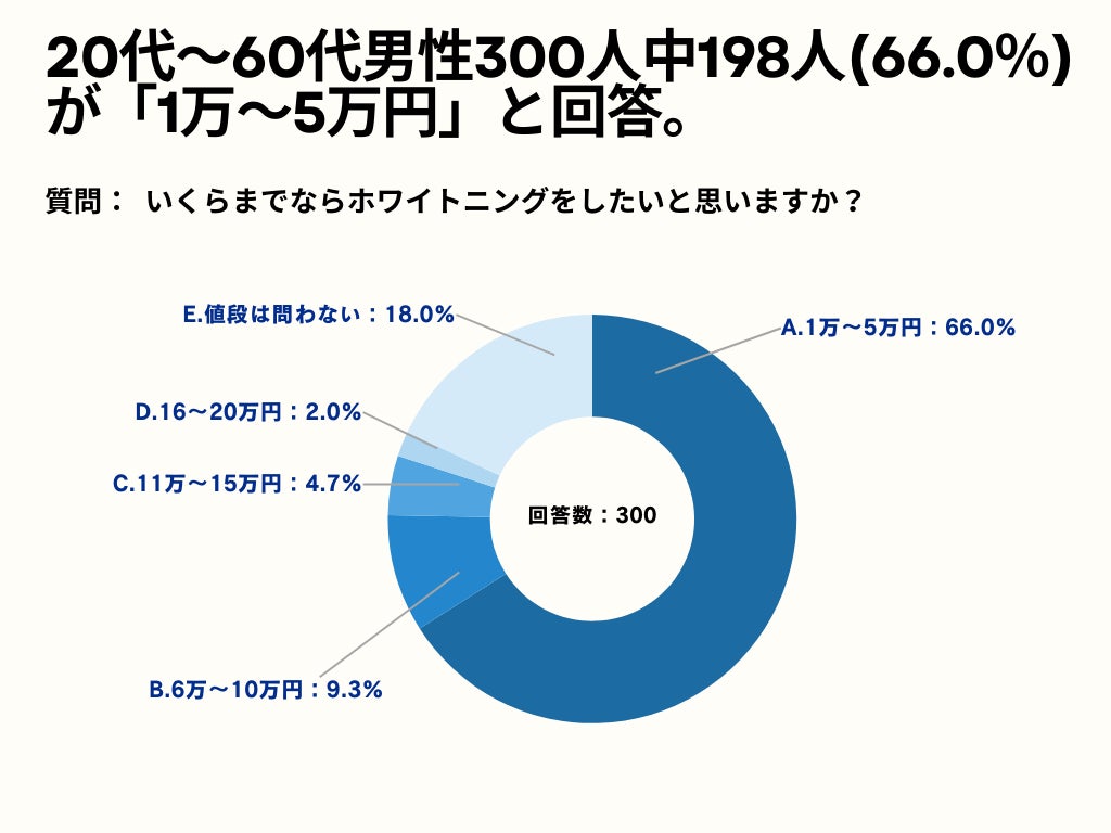 20~60代男性の66%が、「1~5万円」の費用であればホワイトニングしたいと回答。【男性限定_ホワイトニングに関するアンケート】