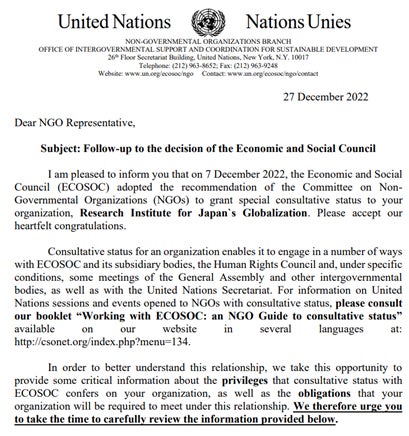 外交の最前線で活躍をした元キャリア外交官が代表理事を務める一般社団法人日本グローバル化研究機構(東京都千代田区、代表理事:原田武夫)は、国連経済社会理事会(ECOSOC)より協議資格である「特殊諮問資格(Special Consultative Status)」が正式に認められ付与されました。2011年に発足した11年後の節目に、経済社会理事会に諮問的地位を有する国連NGOのステータスを獲得し、今後は国連総会を始めとする様々な国連による会合へ参画して参ります。