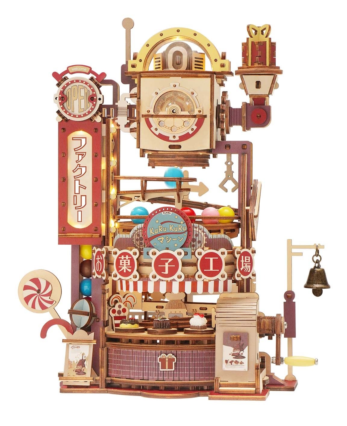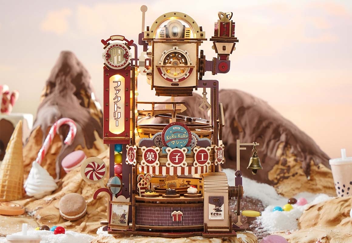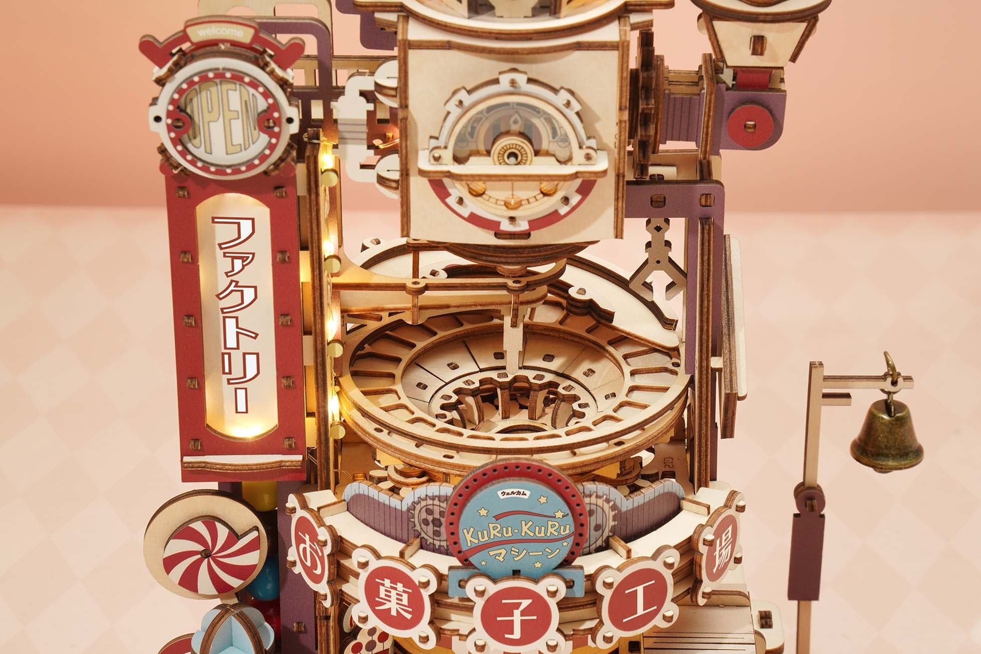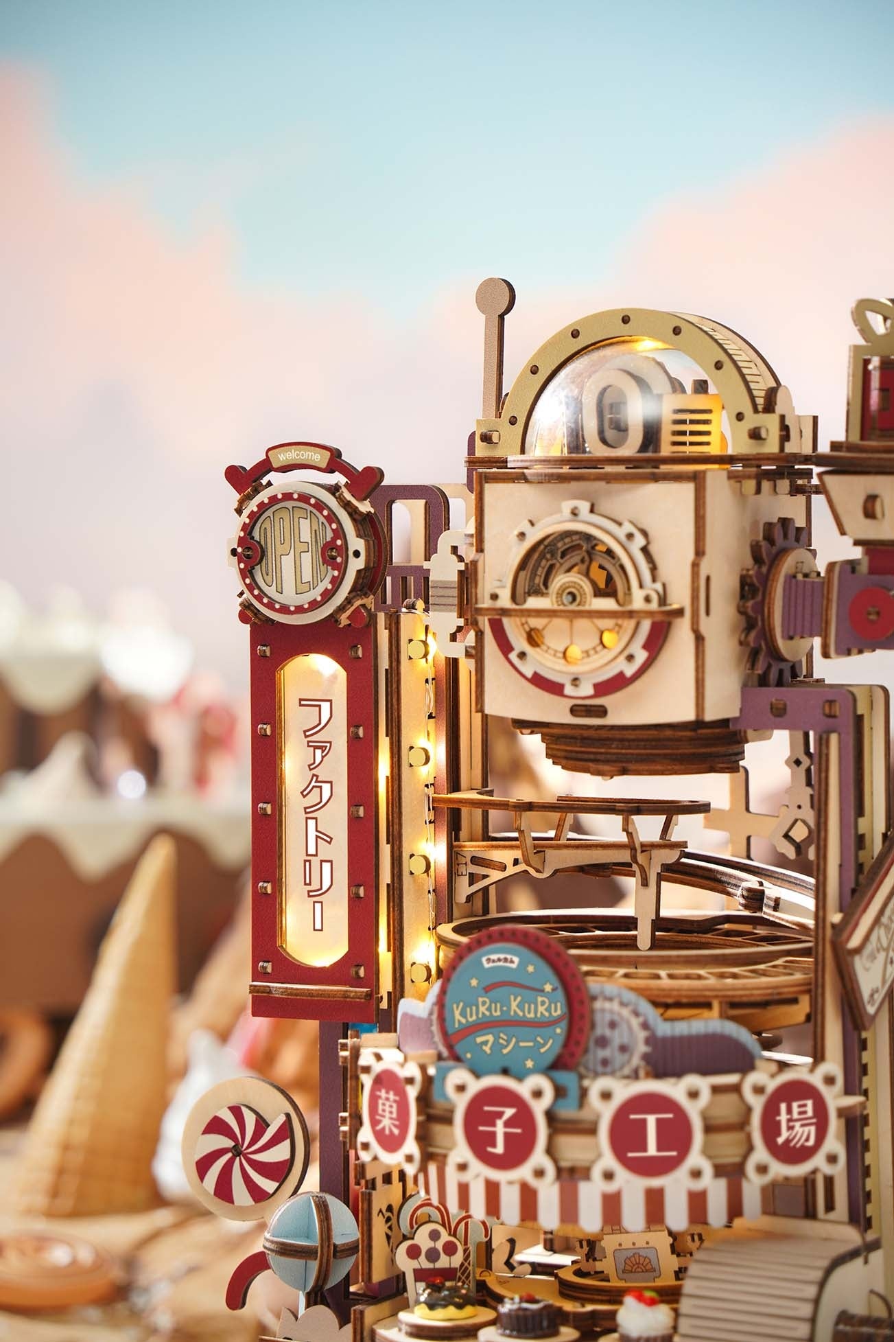 昭和レトロを意識した、ノスタルジーを感じるカラーリングが特徴的で、パーツはすべて着色済みのフルカラーのため、組み立てるだけで写真映えするウッドパズルが完成します。また、LEDライト付きなので、ファクトリーと書かれた看板やウッドパズル上部のプラスチックパーツの中が光ります。ライトを付けると、また違った雰囲気を楽しめます。