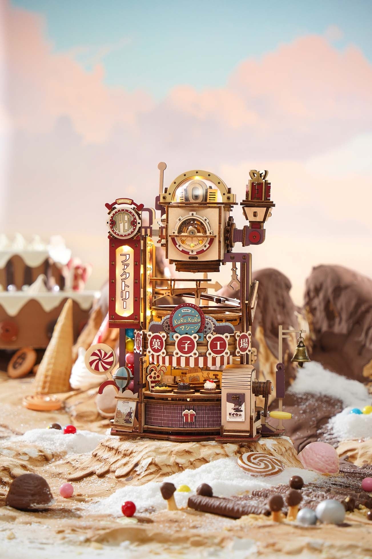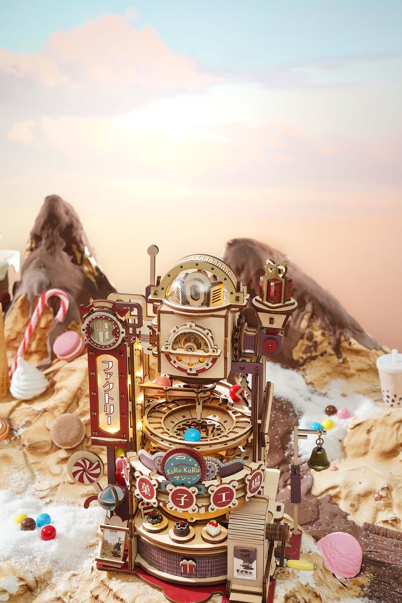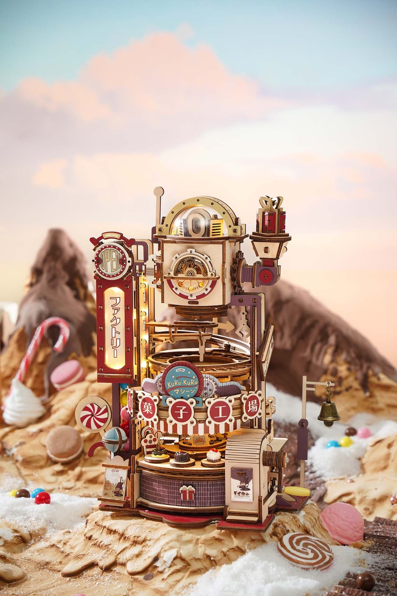 昭和レトロを意識した、ノスタルジーを感じるカラーリングが特徴的で、パーツはすべて着色済みのフルカラーのため、組み立てるだけで写真映えするウッドパズルが完成します。また、LEDライト付きなので、ファクトリーと書かれた看板やウッドパズル上部のプラスチックパーツの中が光ります。ライトを付けると、また違った雰囲気を楽しめます。