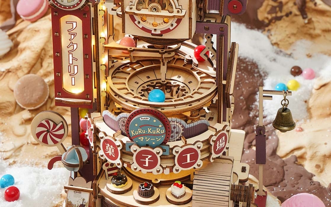 横についている黄色のハンドルを回すと、カラフルなキャンディボールが上から下に流れる仕組みで、つくった後も遊んで楽しめるウッドパズルです。中央のらせん状になったウッドパーツ部分を、キャンディボールが転がっていく様子はやみつきになり、つい何度でも見たくなります。