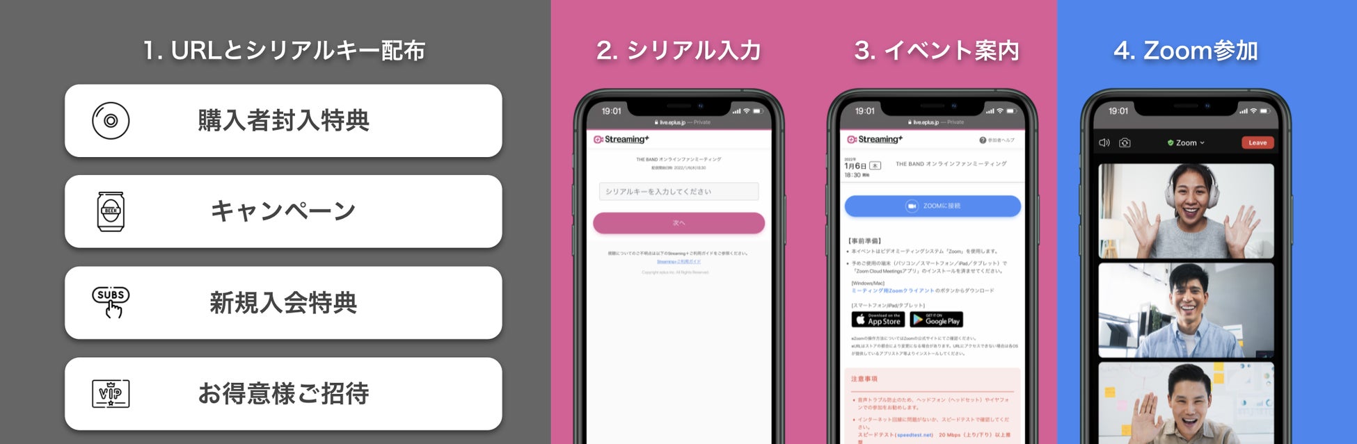 トークイベント、サイン会、レッスン、ファンミーティング等ジャンルを問わず、ファンと出演者がリアルタイムに双方向コミュニケーション可能なオンラインイベントのチケット販売からZoom配信までをワンストップで実現する「Streaming+ LITE Powered by Zoom」を2022年2月17日よりサービス提供開始します。