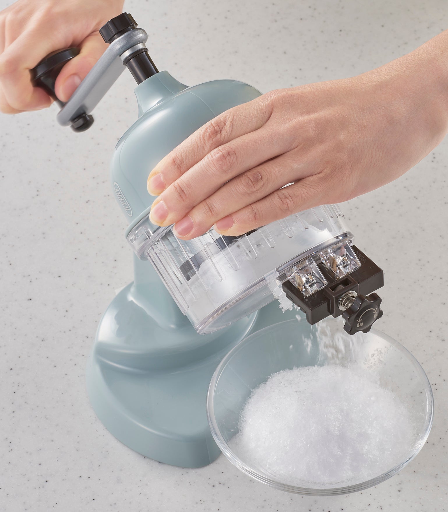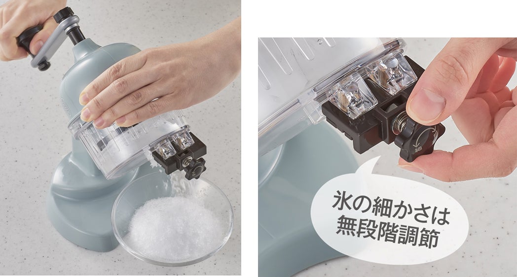 この度発売するかき氷器は、お子さまから大人まで楽しめる手動タイプ。刃の調節ダイヤルで氷の細かさを無段階に調節することができ、ふわふわのかき氷から定番のさらさらとしたかき氷まで、お好みの食感のかき氷をつくることができます。また、牛乳やジュースなどを使った味付きかき氷を始め、市販の冷凍フルーツにも対応。バリエーション豊かなかき氷を楽しむことができます。また、コンパクトサイズでおうちだけでなくアウトドアでも夏気分を味わえます。ハンドルが取り外せて持ち運びや収納がしやすいもの嬉しいポイント。カラーは「ペールアクア」「アッシュホワイト」「ブルーグレー」の3色展開。どこか懐かしいレトロなデザインが印象的な、夏時間を彩るかき氷器の登場です。