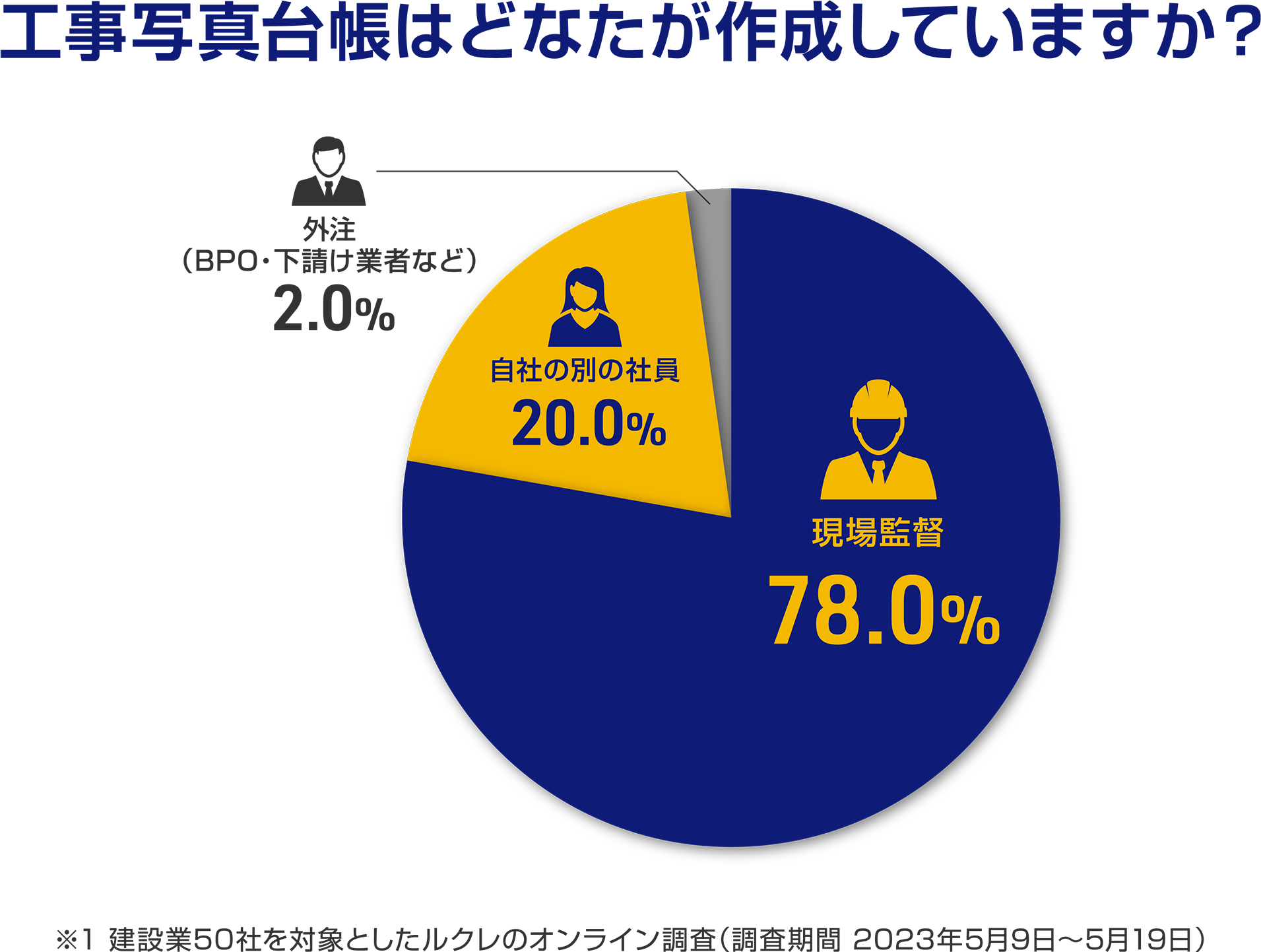 建設業は、2024年4月1日の「働き方改革関連法」適用までに、残業時間を削減することが喫緊の課題。しかしながら、現場監督がひとりで工事写真台帳を作成している割合が78%(※1)という調査結果がでました。現場監督へ業務が集中し、労働時間を削減できていない企業が多くあります。この状況を打破すべく、「クラウド写真台帳」機能により『蔵衛門』は分業化を加速させ、建設業界の働き方改革を推進します。