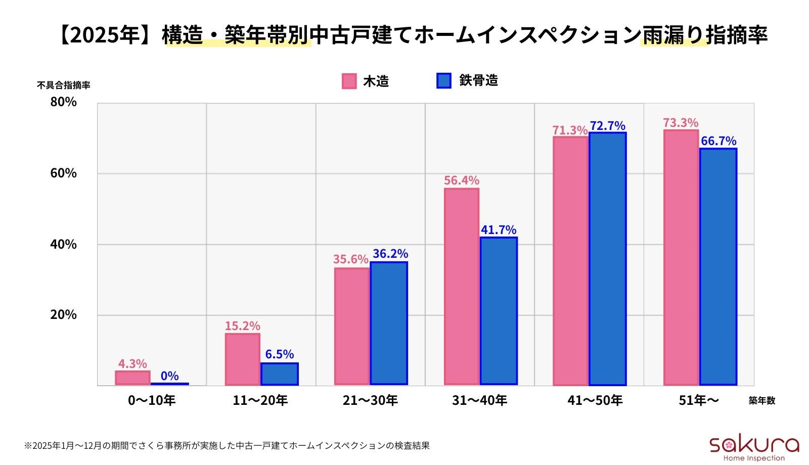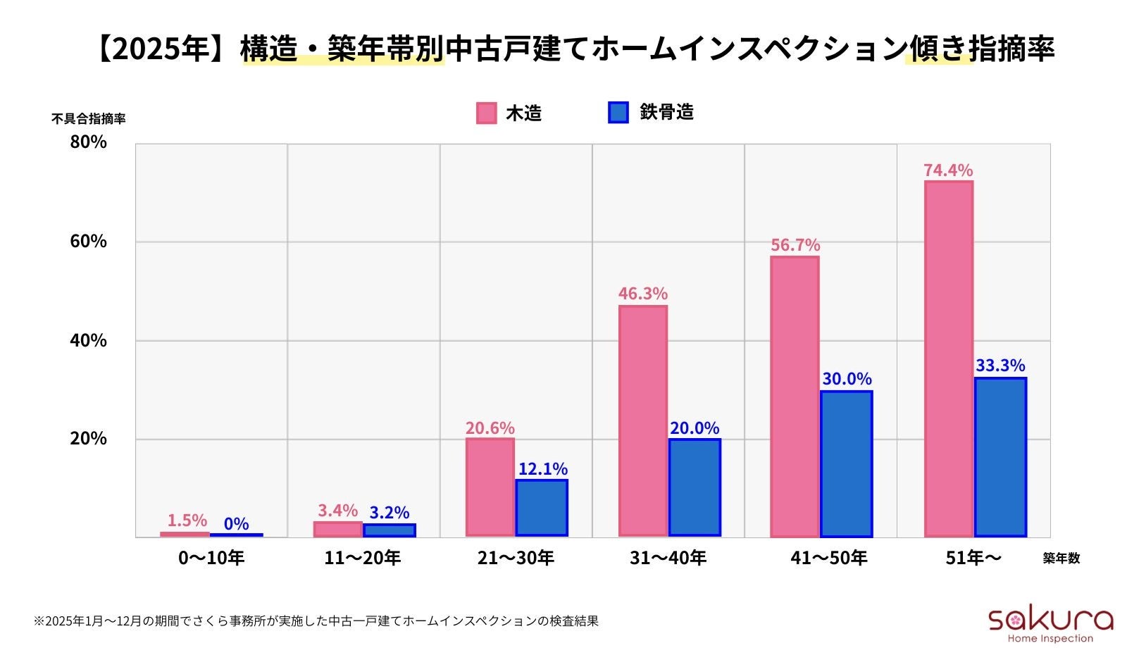 個人向け総合不動産コンサルティング・ホームインスペクション(住宅診断)、マンション管理組合向けコンサルティングを行う“不動産の達人 株式会社さくら事務所”(東京都渋谷区/社⻑:山本直彌)は、2025年にさくら事務所が実施した中古戸建てホームインスペクションにおける主要5項目の不具合指摘率を集計いたしましたのでご報告いたします。