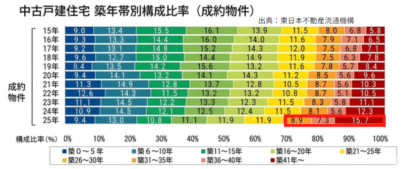 上記の東日本不動産流通機構のデータからも、この10年で築20年までの物件の成約比率は低下し、築31年以上の物件の成約比率が高まっていることがわかります。2025年の築31年以上の中古戸建ての成約比率は31.9%と3割を超えています。