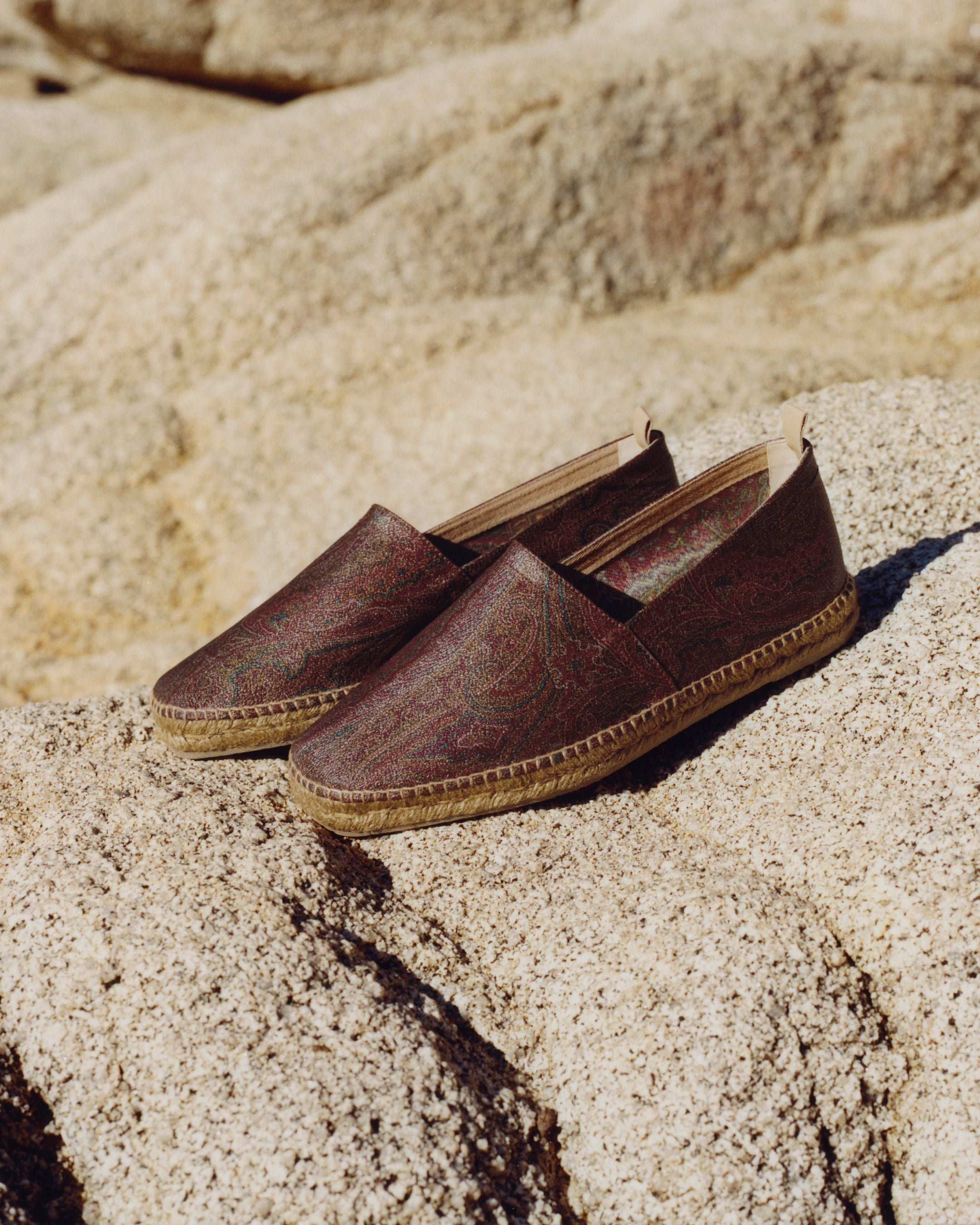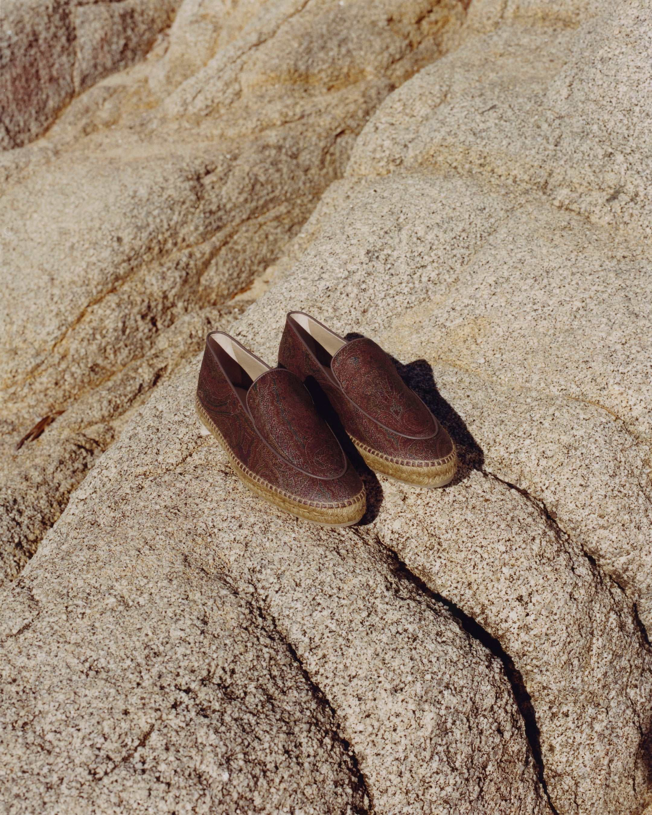 エトロを代表するファブリック「アルニカ」を使用したシリーズは、カスタニエールならではのジュートソールと組み合わせたデザイン。アッパーにスレッディングを施したエスパドリーユや、ブーティー、メンズローファーが登場します。