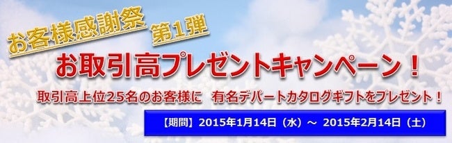 当社では2015年1月14日(水)より日頃のご愛顧に感謝を込めまして、取引高上位25名のお客様に、有名デパートカタログギフトのプレゼントキャンペーンを実施いたします。