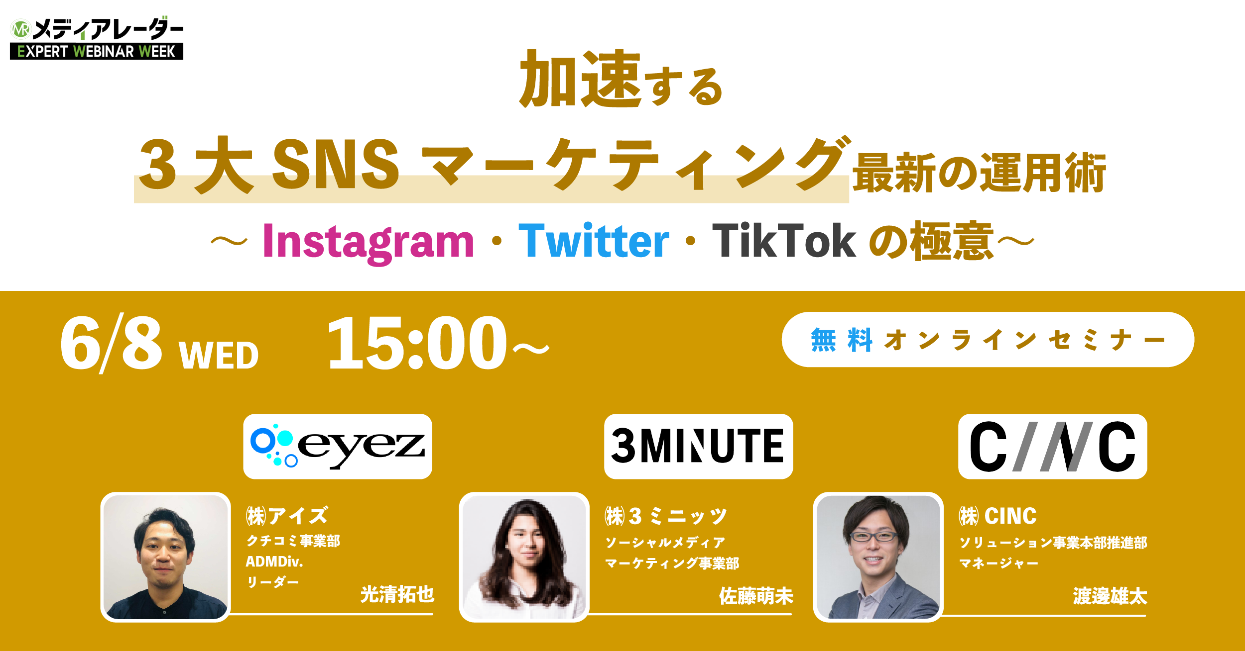 - 「加速する3大SNSマーケティング最新の運用術 ~Instagram・Twitter・TikTokの極意~」6月8日(水)15:00~