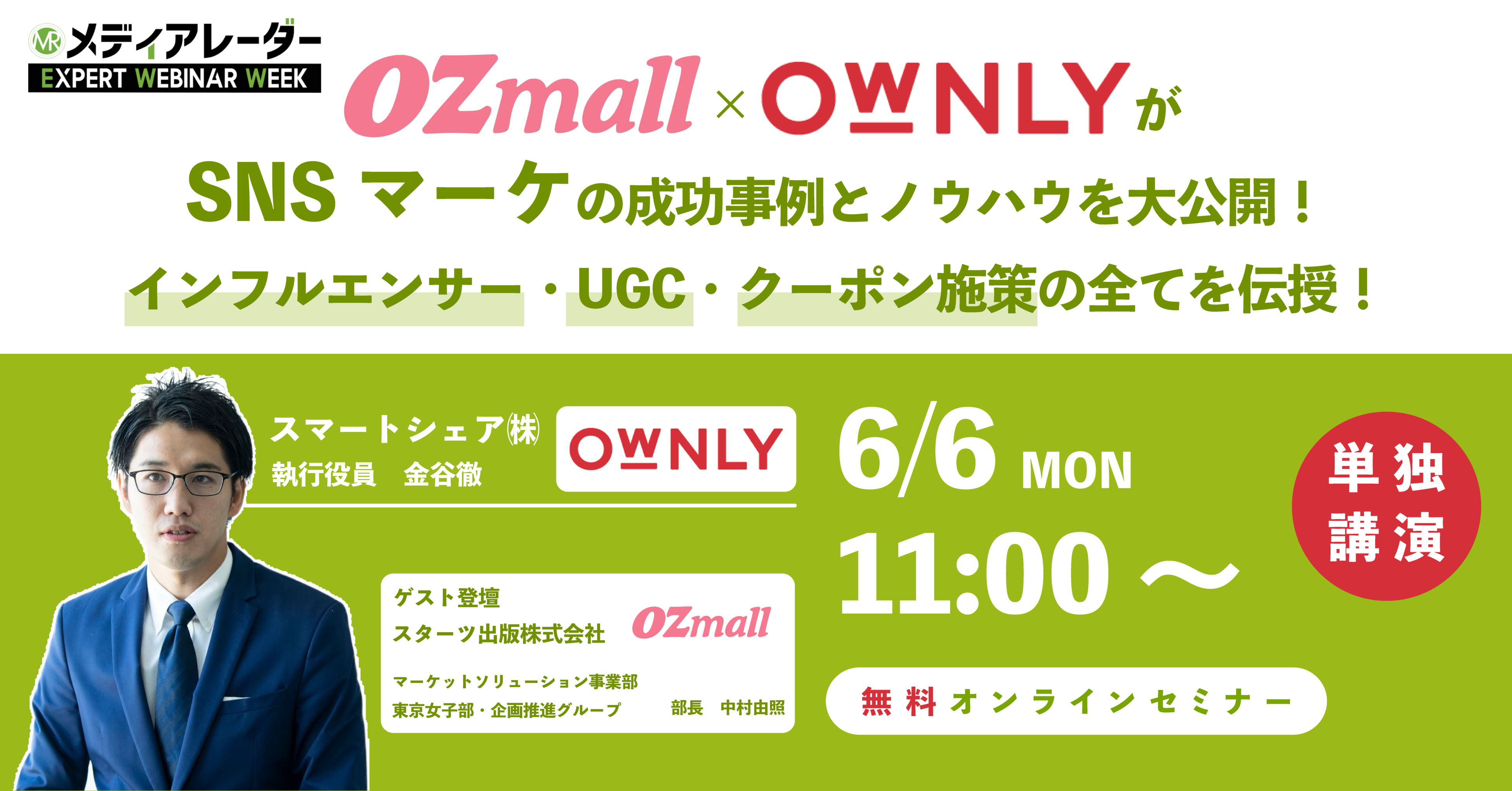 - 「OZmall×OWNLYがSNSマーケの成功事例とノウハウを大公開!インフルエンサー・UGC・クーポン施策の全てを伝授!」6月6日(月)11:00~