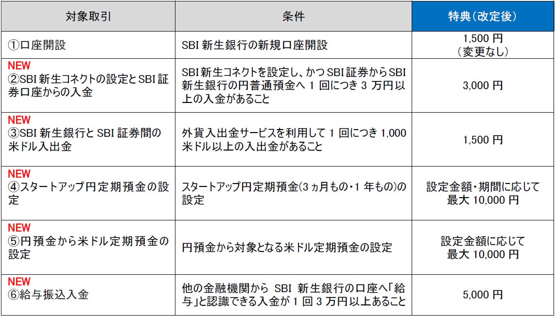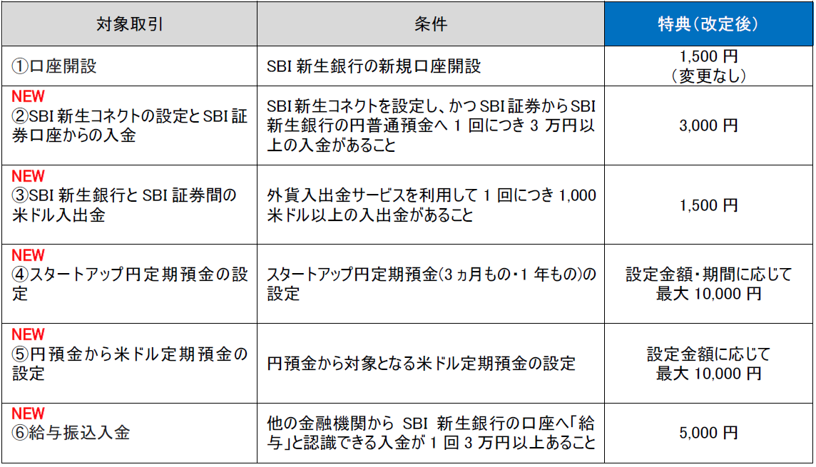 従来は口座開設(①)のみを対象取引としておりましたが、改定後は対象取引を拡大し、SBI新生銀行口座とSBI証券口座間の入出金を自動化できる便利なサービス「②SBI新生コネクト」や、SBI新生銀行とSBI証券間の「③米ドル入出金」を対象取引に追加しております。さらに、今回金利改定した「④スタートアップ円定期預金の設定」、「⑤米ドル定期預金の設定」や「⑥給与振込入金」を加えた全6つの取引が特典付与の対象となります(詳細は下表を参照)。