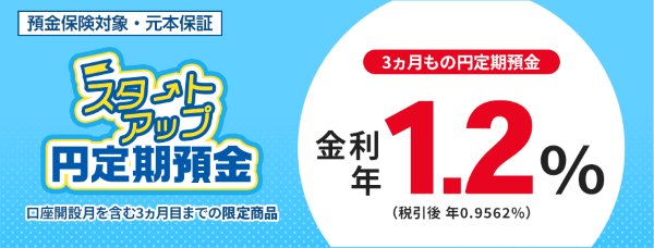 日本銀行の政策金利引き上げに伴う市場環境の変化を踏まえ、スタートアップ円定期預金(3ヵ月もの・1年もの)の金利を改定いたします。スタートアップ円定期預金は新規口座開設されたお客さまが口座開設月を含む3ヵ月目の末日までお預け入れできる円定期預金です。