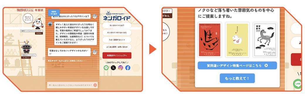 前回の「ネンガロイド」の機能を見直し、より使いやすくなるよう改善。AIの役割を年賀状デザイン検索に特化させ、「もっと教えて!」ボタンを実装することで、同条件での連続検索がスムーズに行えるようになりました。また、スマートフォンから簡単に操作できるよう、ベースデザインをモバイルファーストに変更。最初の選択画面に予め複数の質問を用意することによって、より手軽にチャットを楽しんでいただけます。