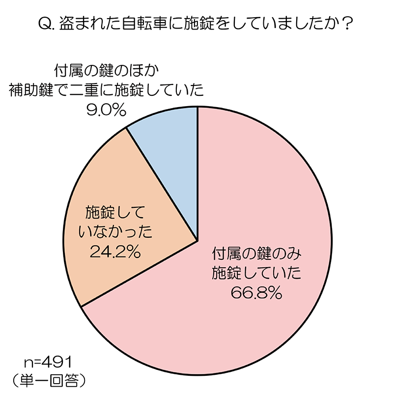 自転車を盗まれたことがある491人に、盗まれた自転車の施錠の有無を尋ねたところ「施錠していなかった」24.2%(119人)、「付属の鍵のみ施錠していた」66.8%(328人)、「付属の鍵のほか補助鍵で二重に施錠していた」9.0%(44人)となりました。二重に施錠することで、盗難防止効果があると言えそうです。警視庁でも、防犯対策として付属の鍵の他に防犯性の高い補助錠を付けることを推奨しています。二重ロックで自転車の盗難を防ぎましょう。