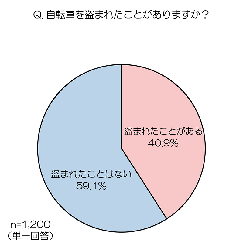 東京都の自転車利用者1,200人に、自転車を盗まれたことがあるかを尋ねたところ、40.9%(491人)と4割以上の人が「盗まれたことがある」と回答しました。