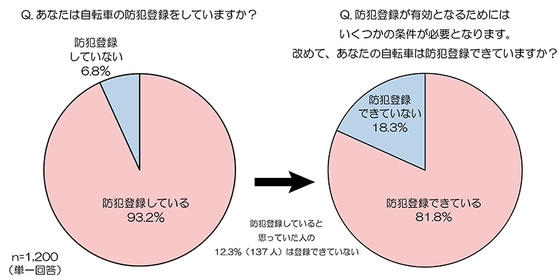 東京都の自転車利用者1,200人に、防犯登録をしているかを尋ねたところ、93.2%(1,118人)が「防犯登録している」と回答しました。