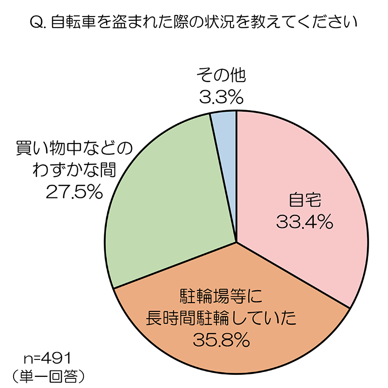 盗まれたときの状況を尋ねたところ「駐輪場等に長時間駐輪していた」が35.8%(176人)、「自宅」33.4%(164人)、「買い物中などのわずかな間」27.5%(135人)となりました。どのような場合でも盗難に遭う可能性があるようです。