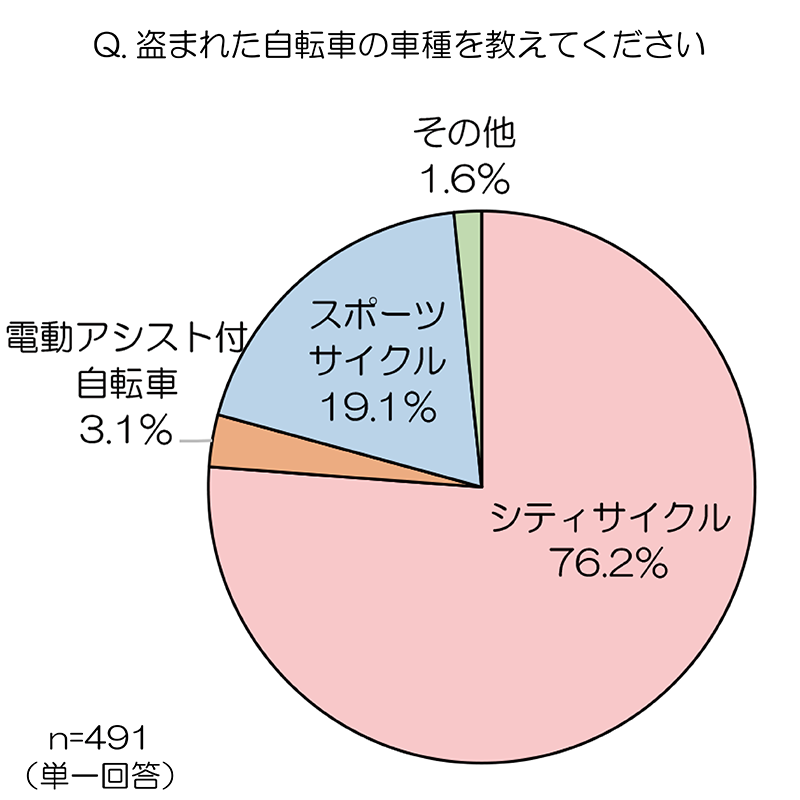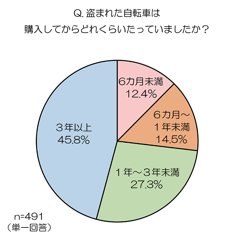 自転車を盗まれたことがある491人に、盗まれた自転車の車種を尋ねたところ「シティサイクル」が最も多く、76.2%(374人)でした。また、盗まれた自転車は購入してからどれくらいたっていたかを尋ねたところ「3年以上」の自転車が45.8%(225人)でした。高価な車種や新車でなくても注意が必要です。