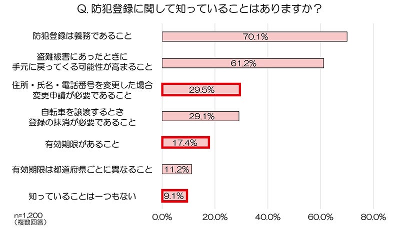 防犯登録に関して知っていることがあるかを尋ねたところ(複数回答)、「住所・氏名・電話番号を変更した場合、変更申請が必要であること」を知っている人は29.5%(354人)、「有効期限があること」を知っている人は17.4%(209人)となりました。また、「知っていることは一つもない」と回答した人も9.1%(109人)おり、防犯登録のルールを知らない人も一定数いるようです。