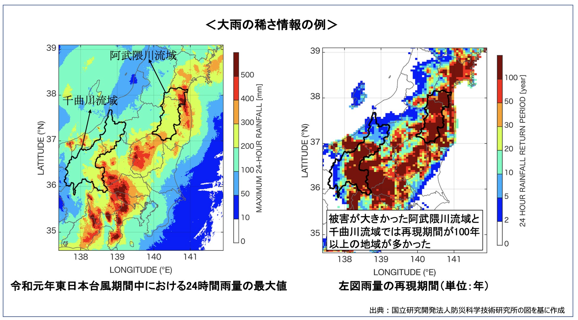 防災科研では、線状降水帯等による豪雨災害の多発を受け、より具体的な避難行動を促すため、「降水量の稀さ」データの研究開発を進めてきました。降水量の稀さ(再現期間)とは、観測された降水量が平均して何年に一度くらいの確率で起こるかを表すものです。再現期間が長いということは、その地域にとって滅多にない稀な規模の大雨であることを意味します。