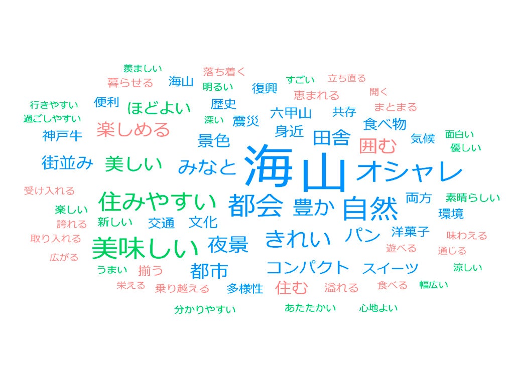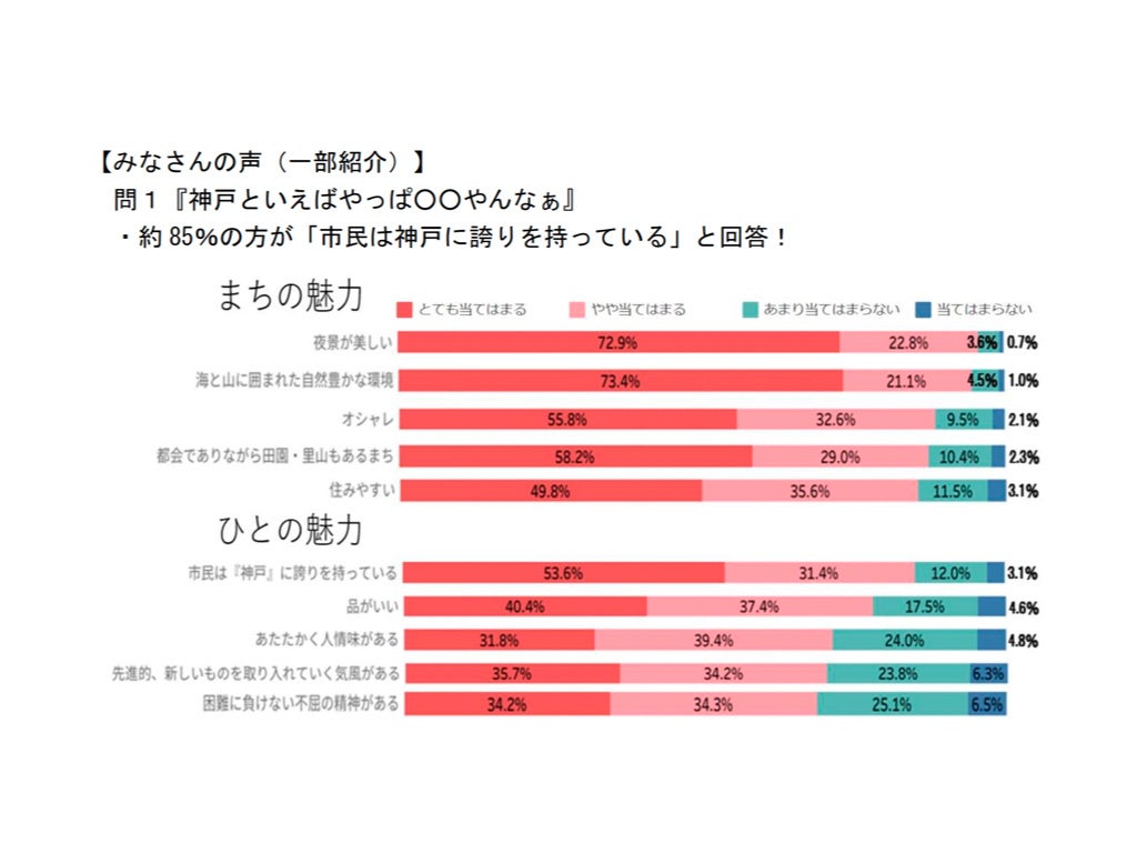 ・選択式のアンケートでは、「あなたが思う『神戸といえば〇〇やんなぁ』という問いで、約85%の方が「市民は神戸に誇りを持っていると回答しました。「夜景が美しい」、「海と山に囲まれた自然豊かな環境」、「オシャレ」、「都会でありながら、田園・里山もあるまち」という設問も当てはまると答えた方が多い結果となりました。詳細は神戸市のホームページ(https://www.city.kobe.lg.jp/a47946/sougoukihonkeikaku6.html)