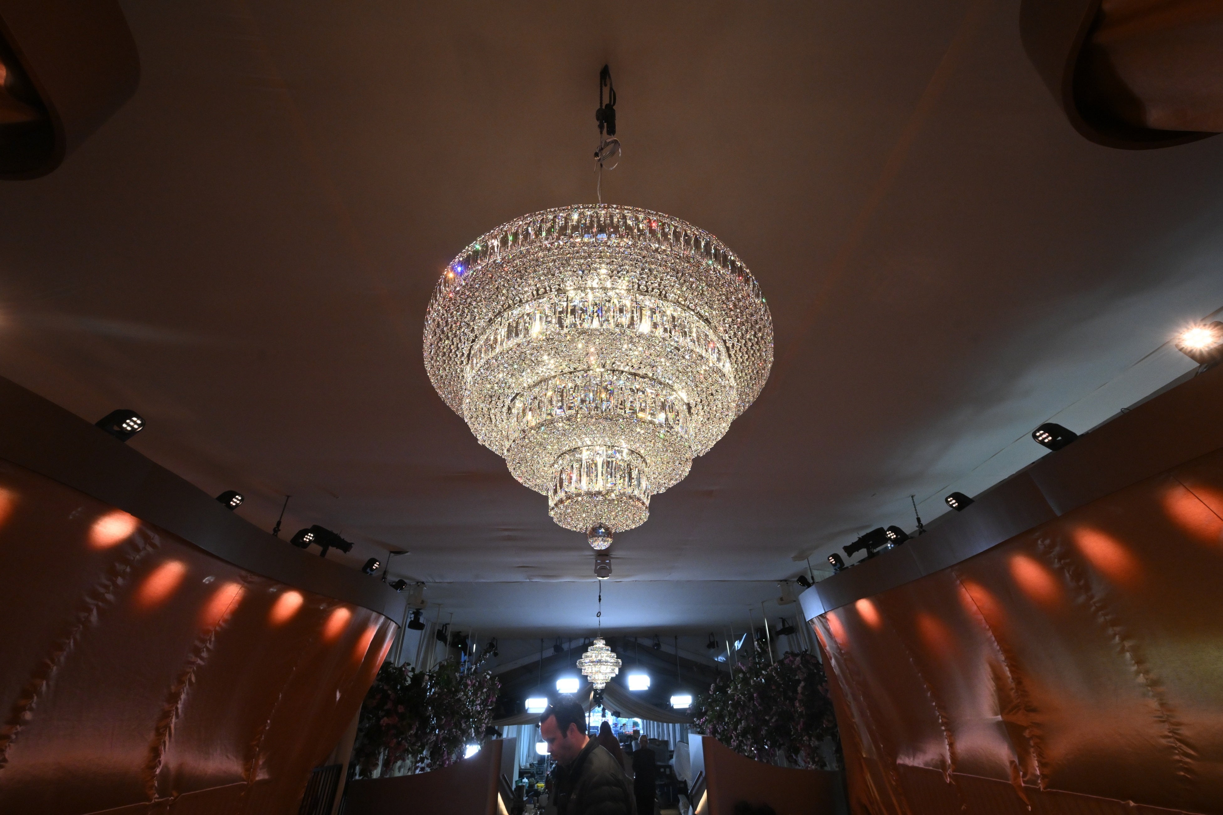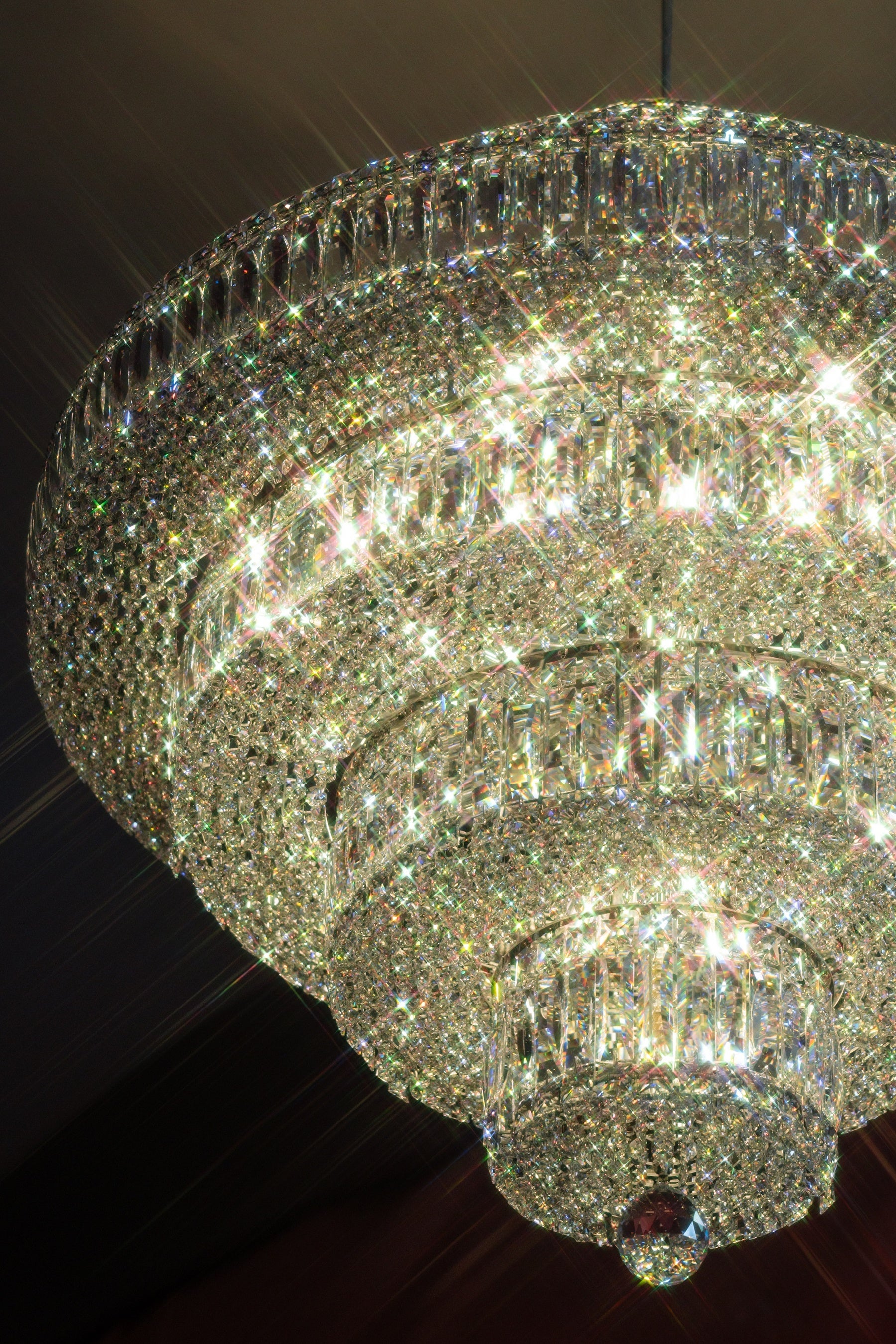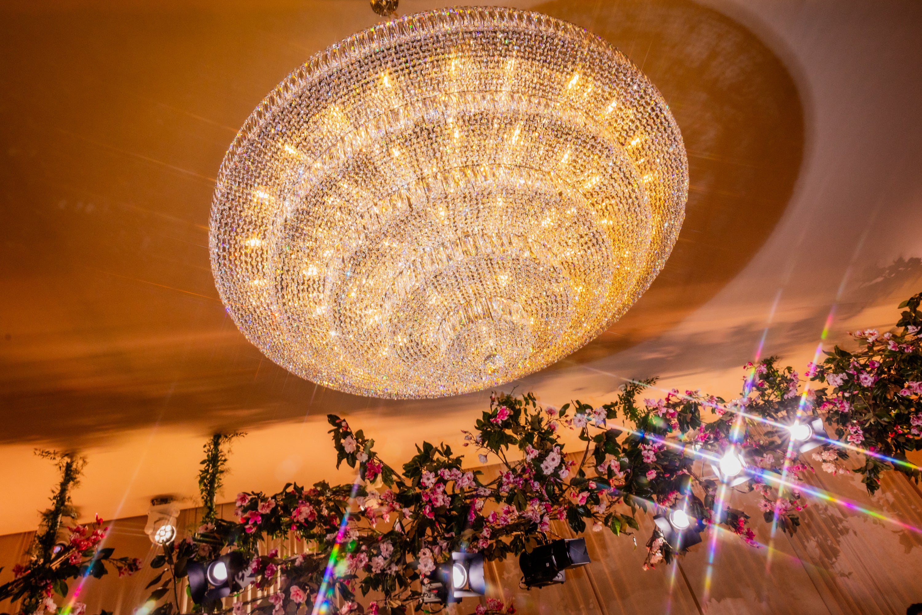 · 3基の36インチシャンデリア(各4,000個のクリスタル)と、約10,000個のクリスタルを使用した60インチのセンターピースを含む合計4基。
