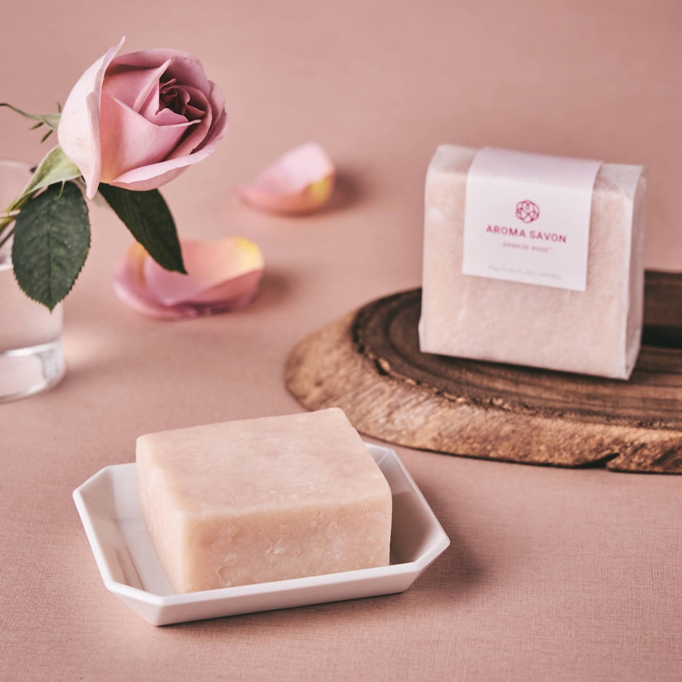 ダマスクローズの香りが上品なナチュラルタイプの固形石けんは、やさしい泡でしっかりと洗いあげます。