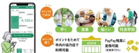 『脳にいいアプリ×健康ポイントサービス』は、自治体の健康促進と商業活性化を目的としたサービスです。脳にいいアプリにて歩行やバイタル管理などの健康活動に加えて、ボランティアなどの社会参加を行うと、健康ポイントが貰え、獲得したポイントは『地域ポイント』や『PayPayポイント』などに変換可能となり、自治体市民の健康と地域経済を盛り上げる画期的なサービスです。