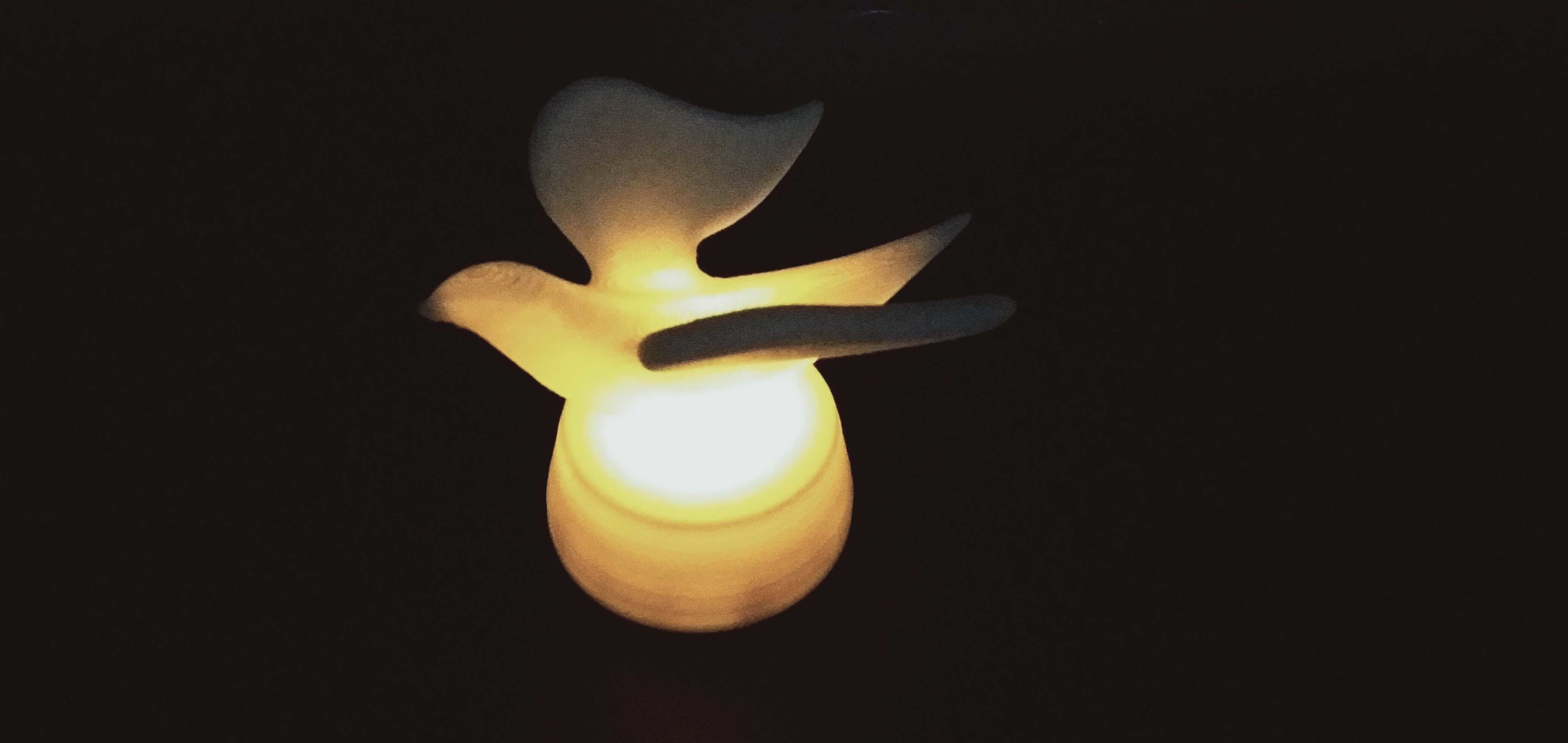「ダヴ」の空ボトルをブランドのシンボルである鳩のかたちのLEDランプにリサイクルしたものです。ライトダウンした店内テーブルの演出に活用します。