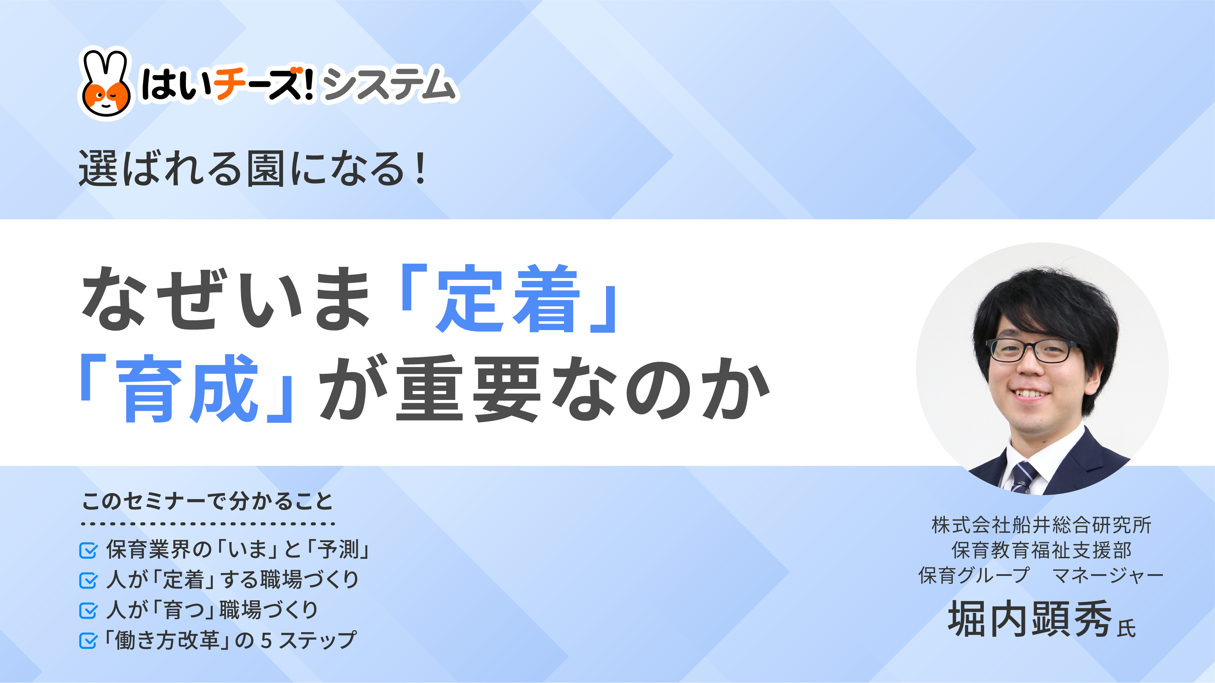 今回のオンラインセミナーでは、株式会社船井総合研究所の堀内氏を講師にお招きし、保育士が「定着」する職場づくりについて人間関係の改善事例から収支状況や仕事内容の見直し方法、また人が「育つ」流れについて採用場面から職務分掌の作成方法、そして「定着」や「育成」が出来る園の未来像についてお話しいただきます。