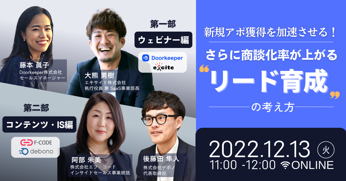 株式会社エフ・コード(本社:東京都新宿区、代表取締役社長:工藤 勉、以下「当社」)は、2022年12月13日(火)に、エキサイト株式会社(本社:東京都港区、代表取締役社長:西條 晋一)、株式会社デボノ(本社:東京都港区、代表取締役:後藤田 隼人)、Doorkeeper株式会社(本社:福岡県福岡市、代表取締役:ジョン・クロス)と4社共催で無料ウェビナー『新規アポ獲得を加速させる!さらに商談化率が上がる リード育成の考え方』を開催します。