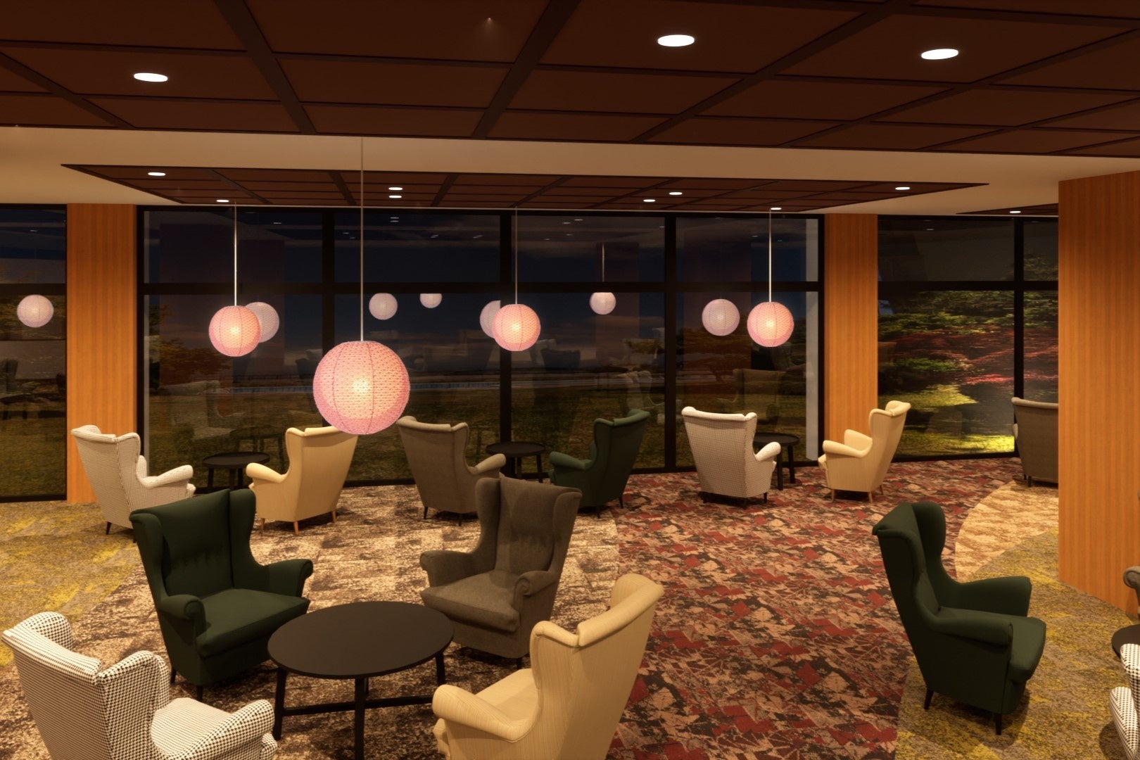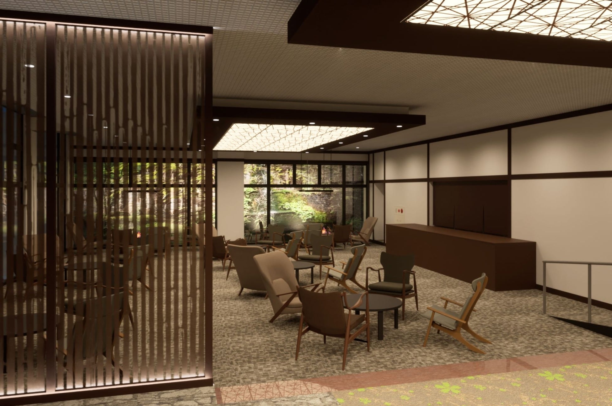 ロビーには新たにプレミアムラウンジを設置いたします。各種ソフトドリンク・アルコールをご用意しております。昼は柴山潟の噴水や霊峰白山を望み、夜にはライトアップした中庭が非日常を演出します。