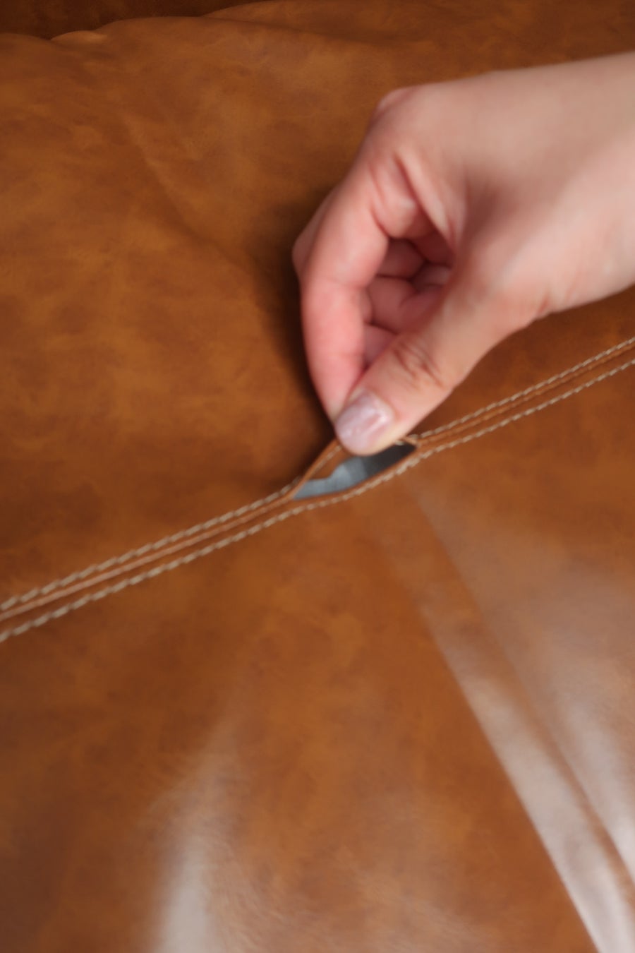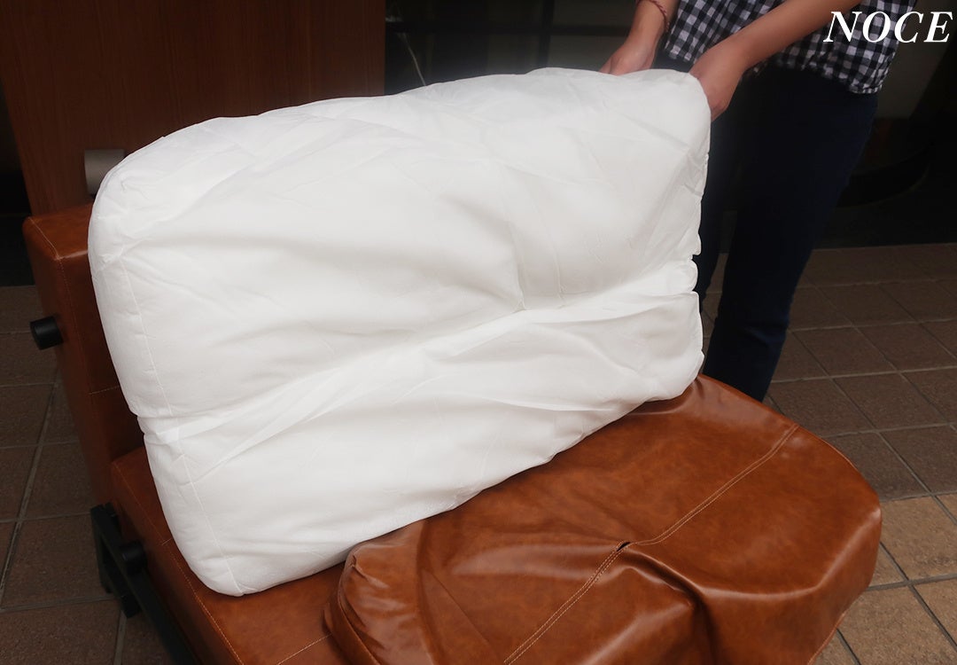 背もたれクッションのジッパーから中材を取り出すと、カバーより一回り大きく膨らみます。低反発素材によるものと考えられますが、従来の素材より軽く密度も低い印象です。膨らんだ中材をカバーに押し込むと、カバーが膨らんできます。