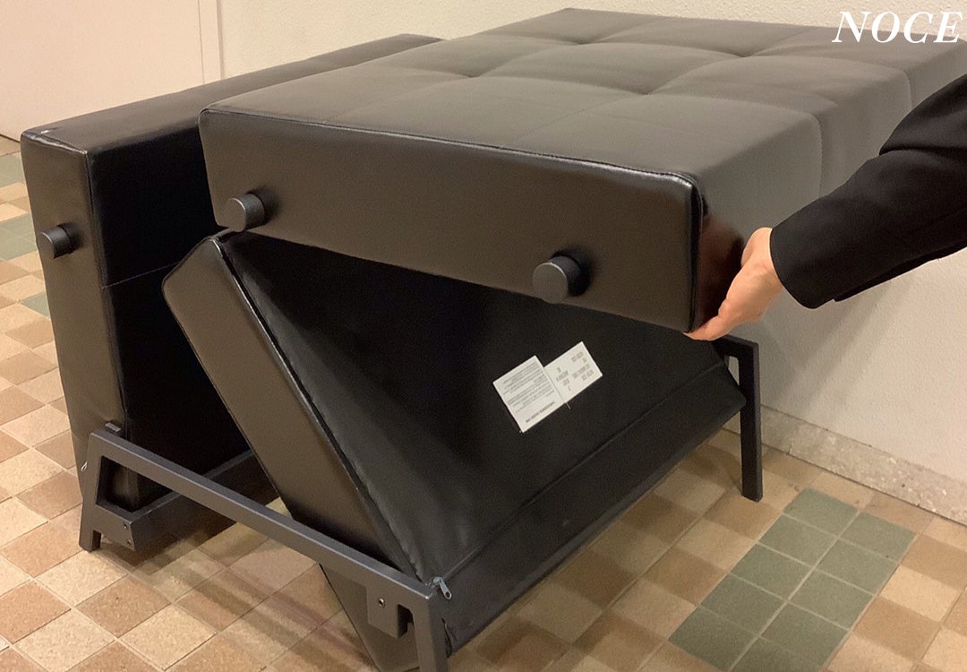 座面にあるベルトを引っ張り、座面を上部分を背もたれに立てかけて座面内に収納されている脚をそのまま前にだしてフラットにした状態で床に付け、背もたれを前に倒すと簡単にベッドへと変えられます。