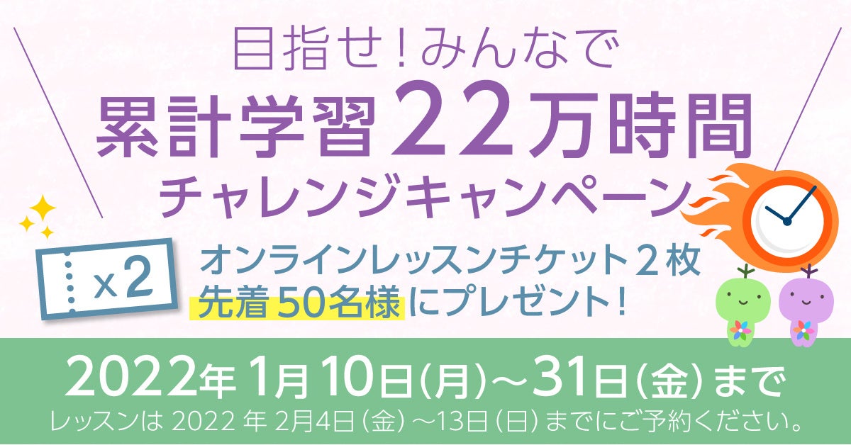 株式会社ポリグロッツ(本社:東京都新宿区、代表取締役:山口隼也)は、2022年マンスリーチャレンジ企画として『目指せ!みんなで累計学習22万時間チャレンジキャンペーン』を開催いたします。