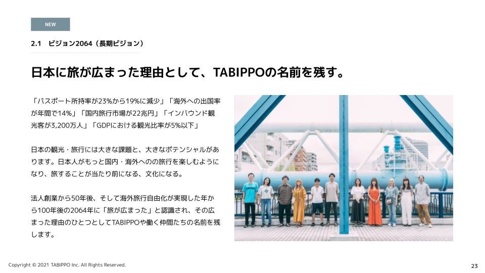 パスポート所持率23%、海外への出国率が年間で14%など、日本の観光にはまだまだポテンシャルが秘められています。それは日本人がもっと国内・海外への旅行を楽しむようになる未来があるということです。TABIPPOの法人創業から50年後、そして海外旅行自由化が実現した年から100年後の2064年、旅が広まった理由のひとつにTABIPPOの名前を残します。