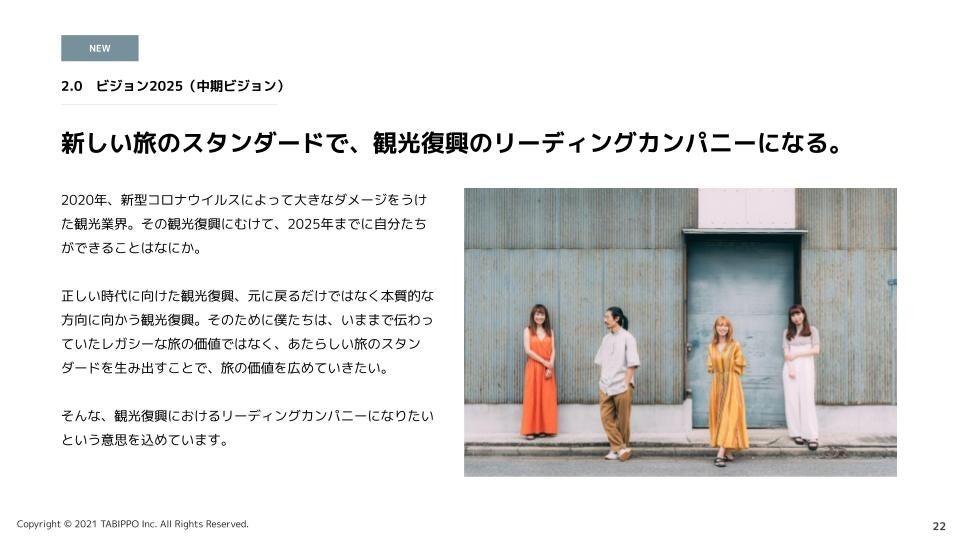 新型コロナウイルスの蔓延により、2020年に大きなダメージを受けた観光業界。さまざまな課題にあふれていた観光業界でしたが、コロナを契機として「正しい方向にむかって、復興させていこう」というパワーに溢れていると感じています。2020年からちょうど5年後、観光業界が戻るとされている2025年までに、TABIPPOは観光復興のリーディングカンパニーを目指します。これまでの観光に戻るだけではなく、本質的な方向に向かう観光復興として、ニューノーマルなあたらしい旅の価値を広めていきます。