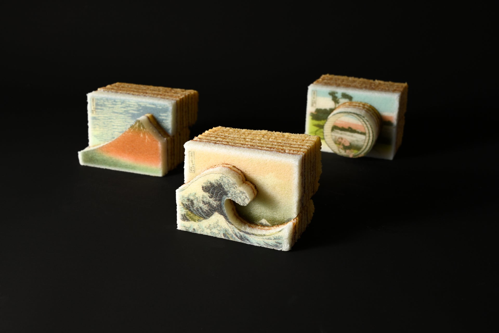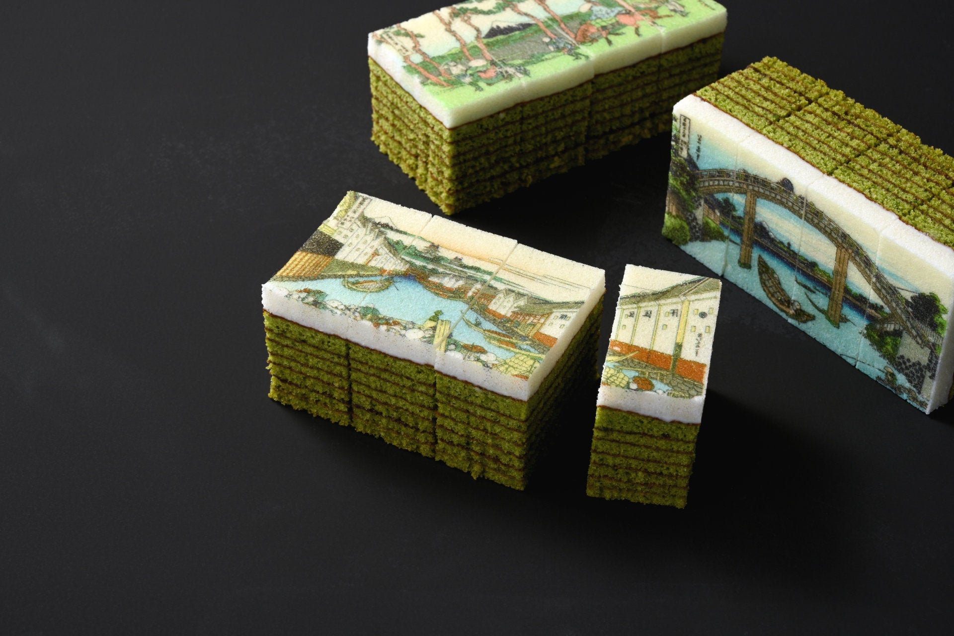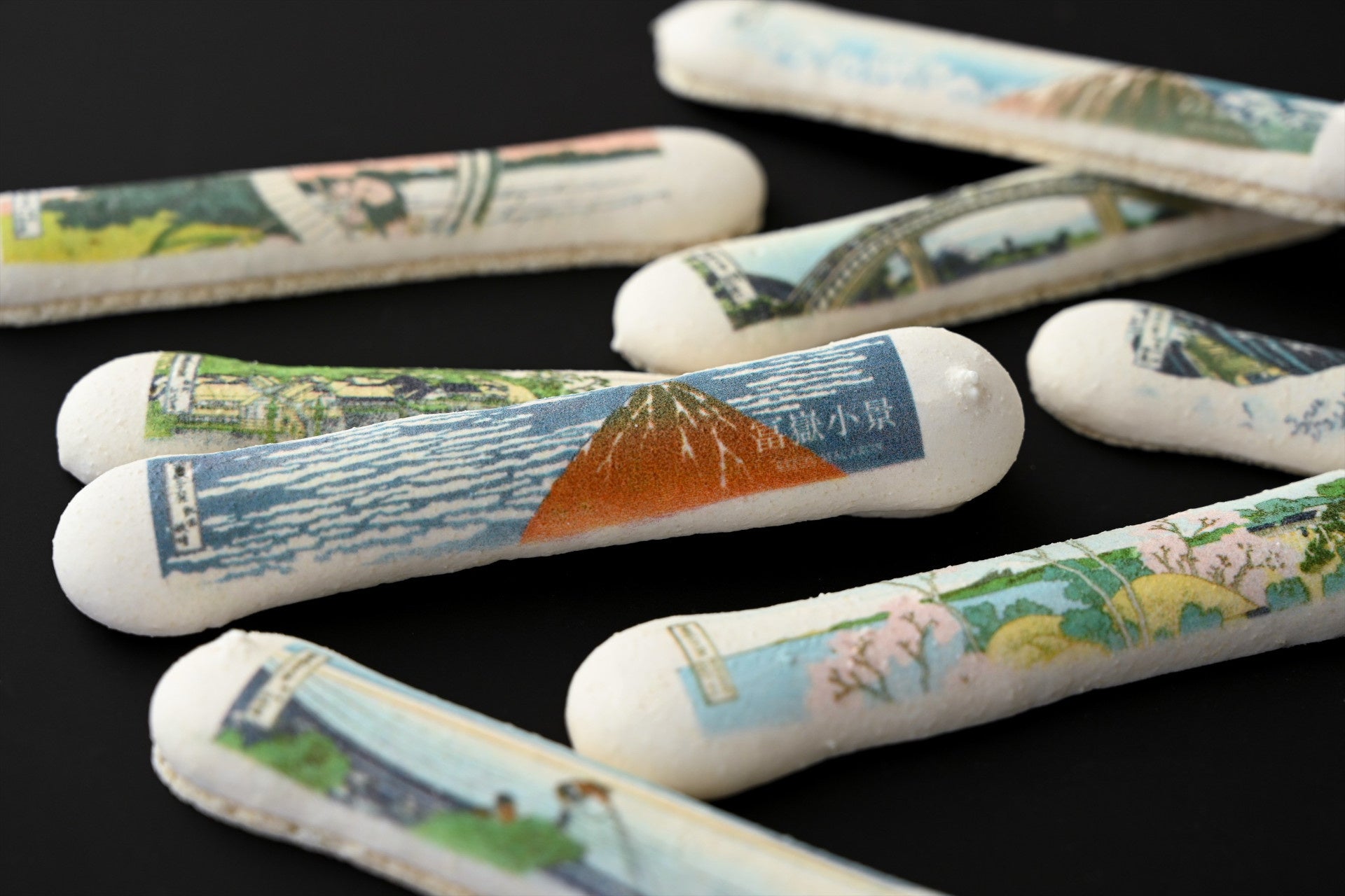 あわせて、葛飾北斎『冨嶽三十六景』をモチーフにした〈冨嶽小景〉シリーズも登場。北斎の代表作《神奈川沖浪裏》や赤富士として知られる《凱風快晴》などを大胆にプリントした「冨嶽小景 型抜きバウムクーヘン」や「冨嶽小景 バトンマカロン」に加え、一枚の浮世絵をまるごとプリントした「Fine Print Baum 冨嶽小景」も新たにラインナップ。