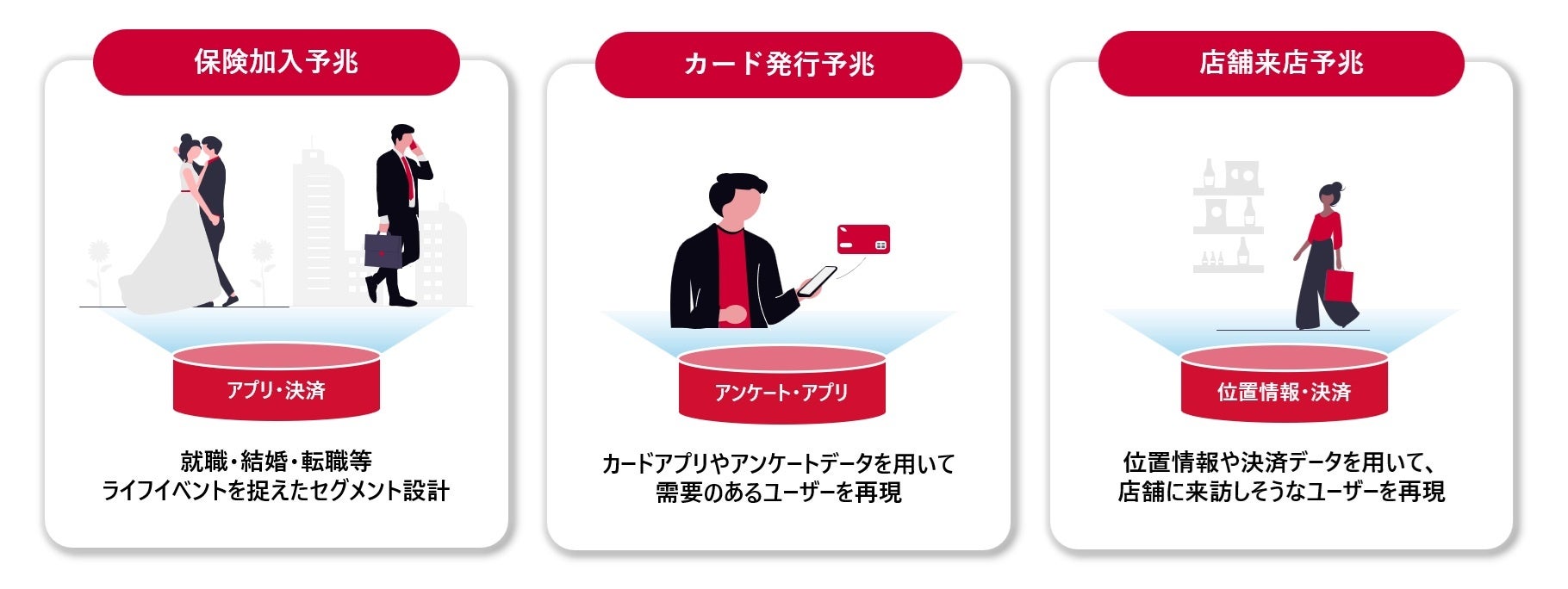 位置情報や決済データ、アプリログなど多種多様な“ドコモデータ”を活用し、ライフイベント予兆や購買予兆、アプリインストール予兆等、ニーズに合わせた予兆セグメントの作成が可能